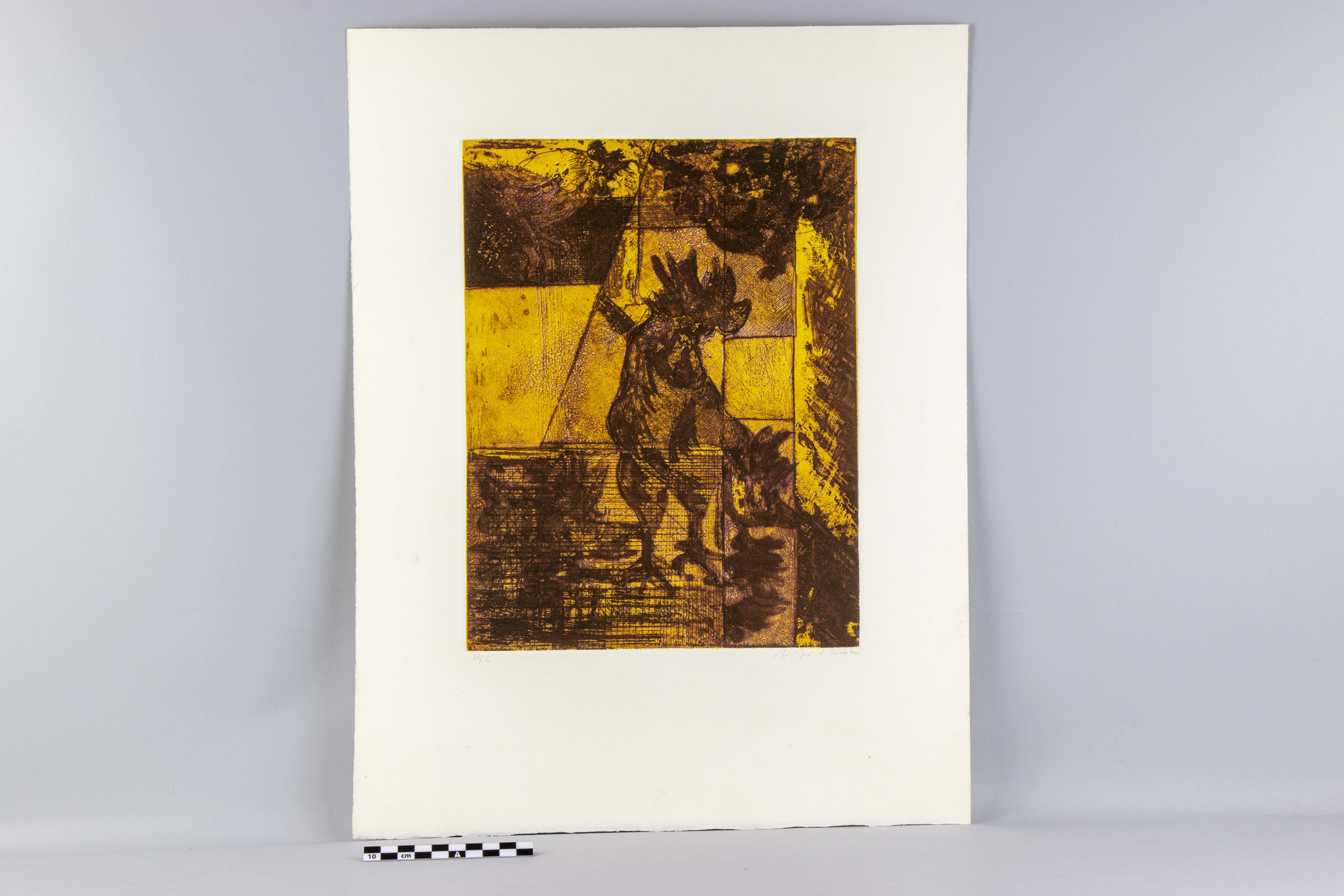 Sobre un fondo dividido en secciones irregulares mediante líneas que forman polígonos cuadrangulares de diferente tamaño, se recorta en el centro de la estampa la figura de un ser con patas y cresta de gallo. La estampa es rica en texturas y basa su cromatismo en dos colores, amarillo y marrón, generando tonos intermedios mediante los diferentes grados de incisión en la plancha de zinc.