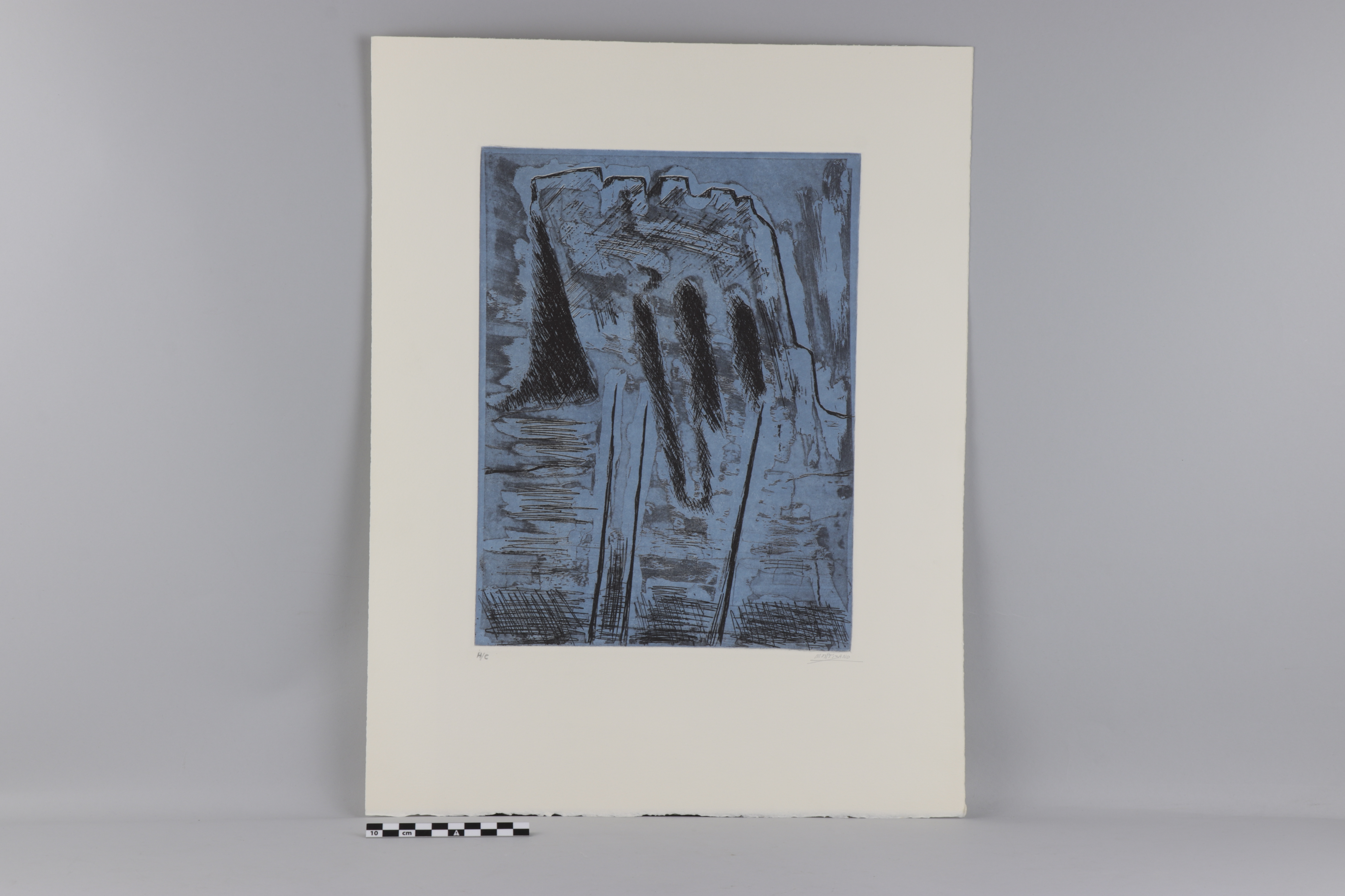 Predominio de tonos azules en la base y de negros en los detalles en una composición abstracta donde predomina la verticalidad a través de líneas y manchas.