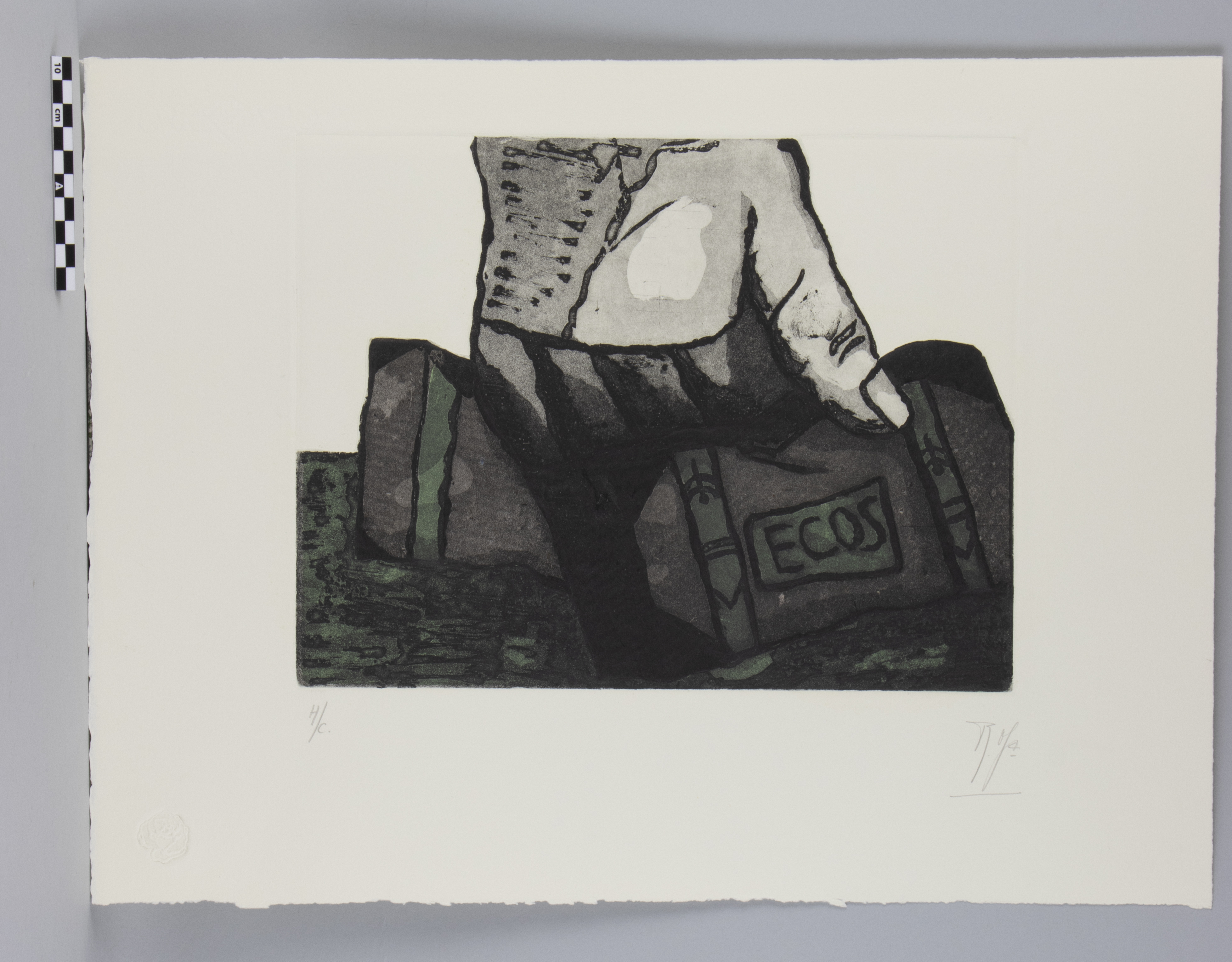 La estampa, grabada en tonos grises y negros con ligeros toques de verde, presenta una mano que agarra dos maletas pequeñas de tamaño desproporcionado, una de las cuales cuenta con una etiqueta con la palabra ECOS. El trazo grueso de las líneas contrasta con la transparencia de las tintas que, casi a modo de acuarela, deja ver en ocasiones el blanco del papel, en un juego de contrastes de texturas densas, de gran intensidad, con otras muy líquidas y luminosas.
