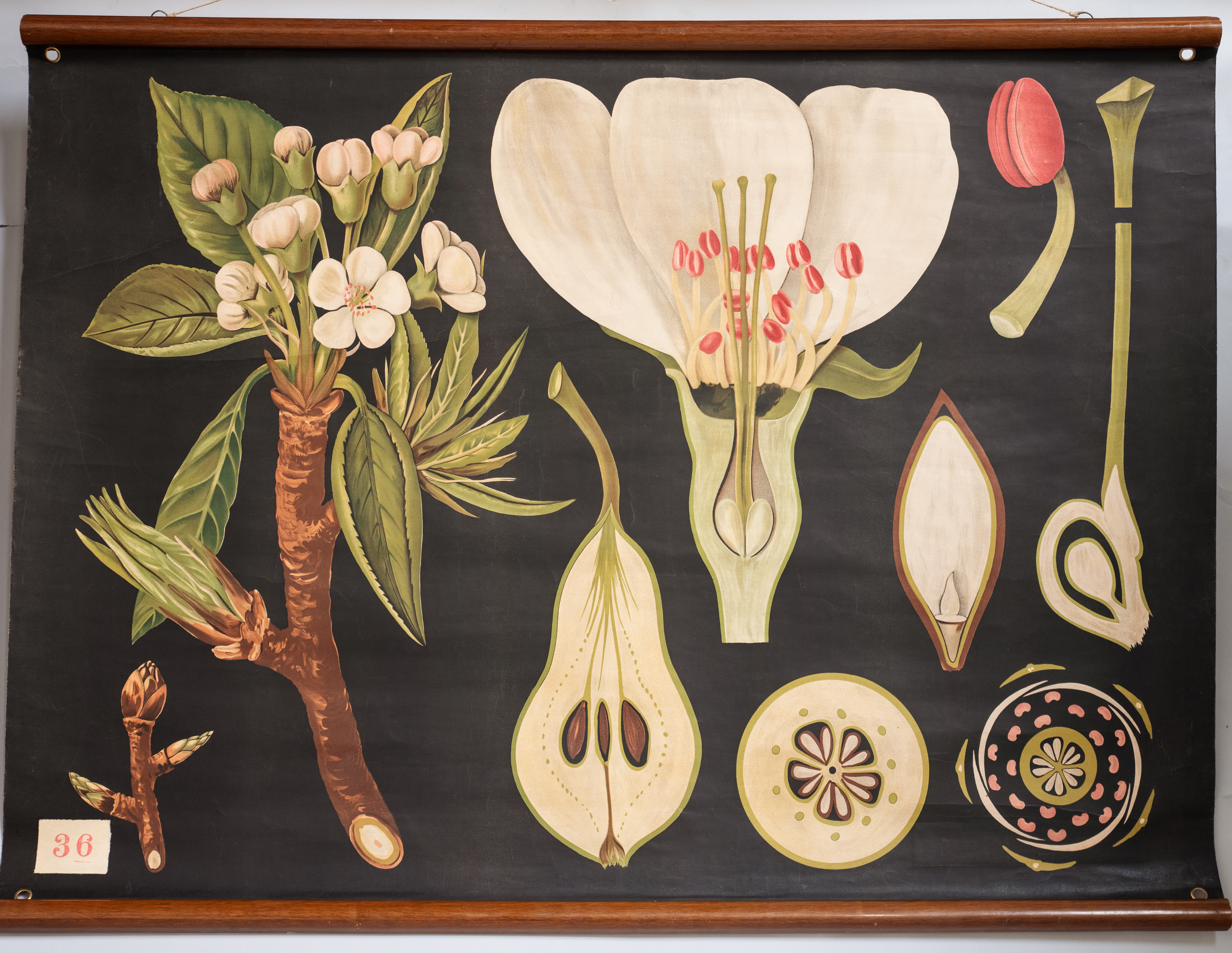 La lámina muestra, sobre un fondo negro, distintos aspectos de la anatomía del peral (Pirus communis) como el desarrollo de sus brotes o la anatomía de su flor y su fruto.
