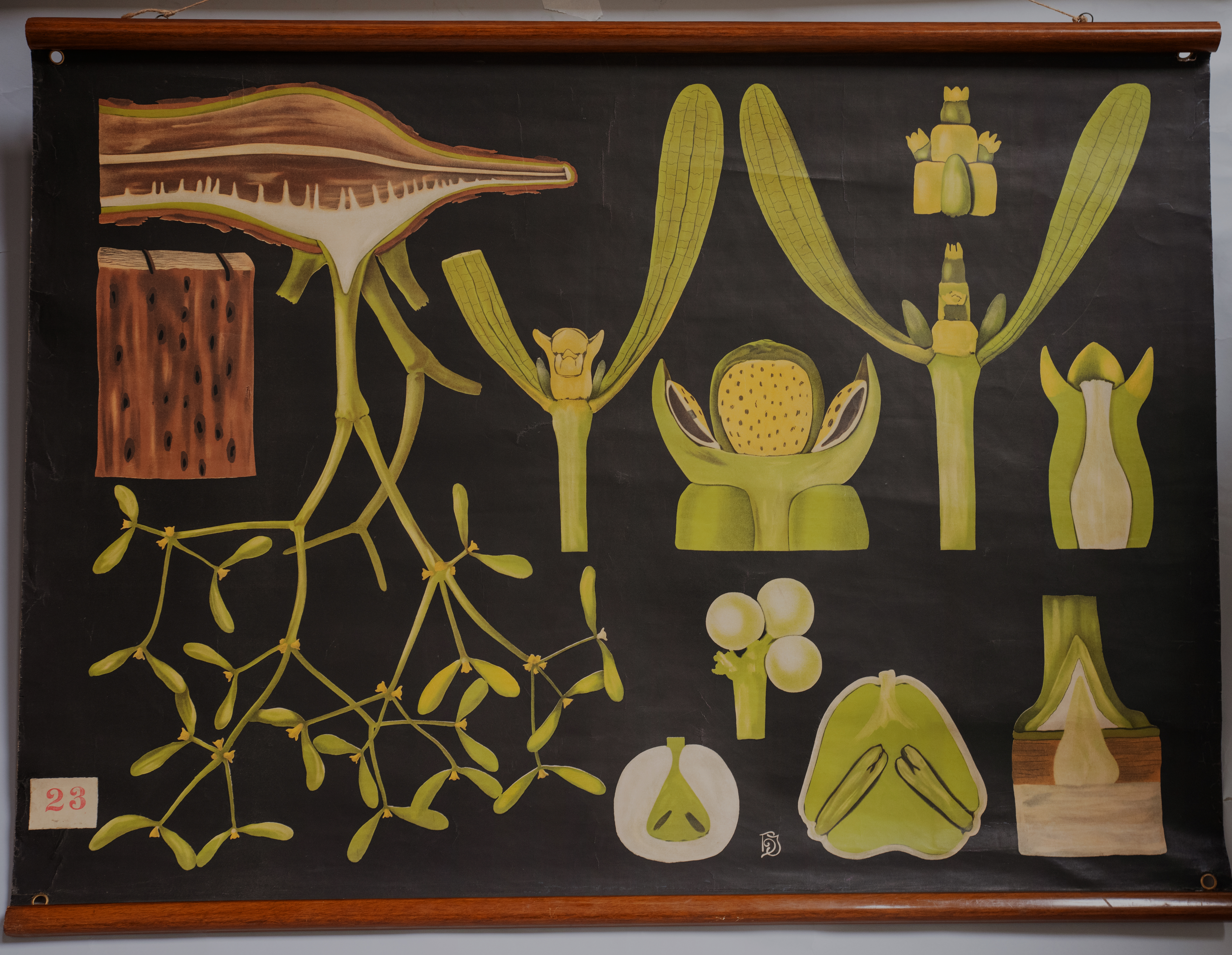La lámina de papel entelado nos muestra, sobre un fondo negro, distintos aspectos de la anatomía del muérdago (Viscum album) como la forma en la que esta planta semiparásita se ancla a las ramas de su huesped o el aspecto interno de sus diminutas flores y de sus pequeños frutos o bayas traslúcidas muy apreciadas por las aves.