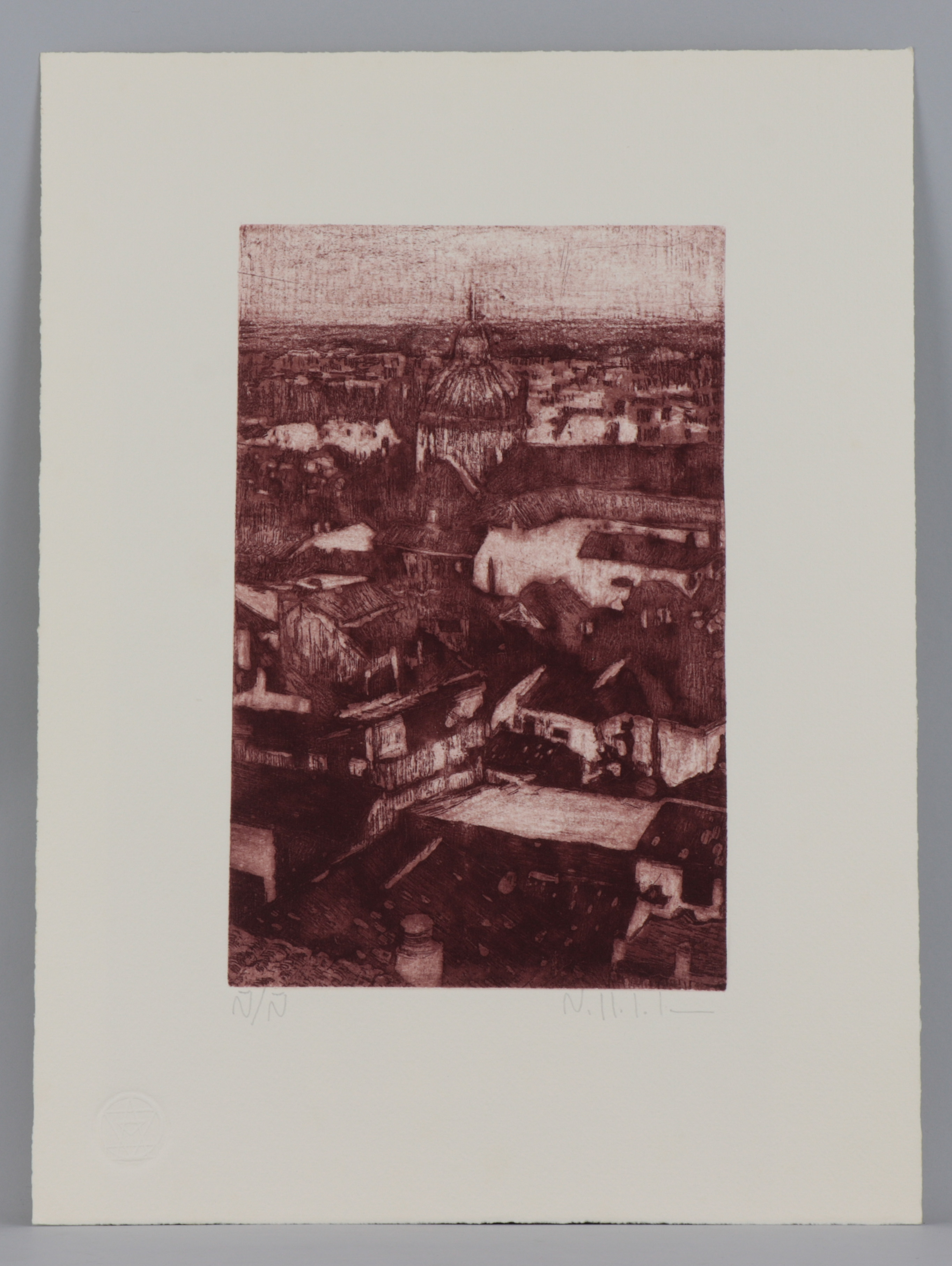 Grabado con matriz de una plancha de zinc. Estampado a una tinta, carmín, en hueco, sobre papel superalfa 250 gr. En él se representa una población con casas de paredes blancas destacando en el centro de la composición la cúpula de una iglesia, probablemente de Santo Domingo ya que es una vista del barrio del Realejo de Granada.