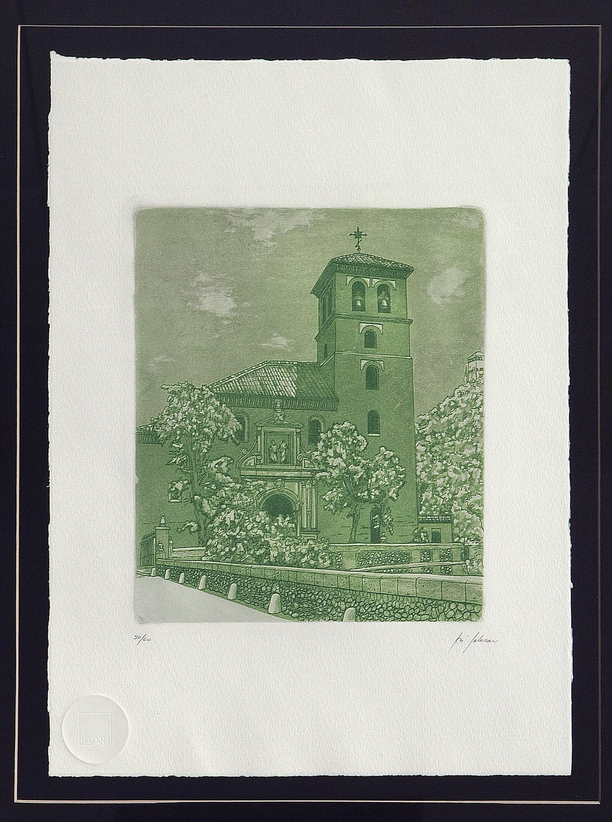 Composición monócroma en tonos verdes tomando como motivo central la fachada principal de la iglesia parroquial de San Pedro y San Pablo desde la carrera del Darro, ante el Convento de Santa Catalina de Zafra. Está realizado con una técnica mixta con aguafuerte y resina.
