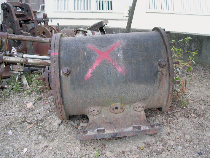 Esta bomba de vacío perteneciente a una máquina de vapor tiene la apariencia de cilindro metálico de grandes dimensiones sellado mediante unos tonillos robustos y está marcada con una gran "X" realizada con pintura roja en una de sus caras. Su funcionamiento se fundamenta en la extracción de moléculas de gas del interior de un volumen sellado para, de este modo, crear un vacío parcial.