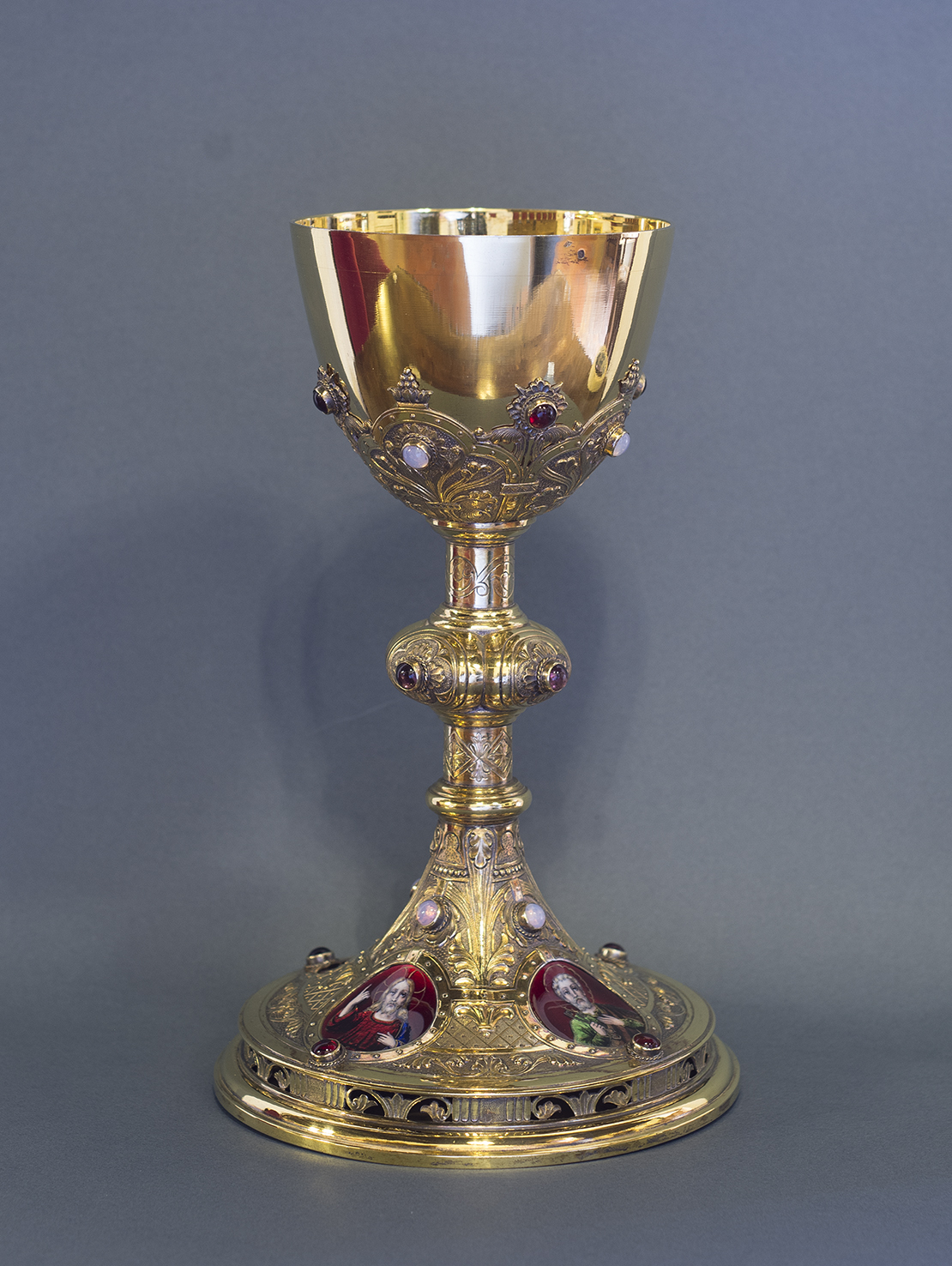 La parte exterior del vaso está decorado con relieves e incisiones de arcos, bajo los cuales se disponen cuatro piedras semipreciosas, semiesféricas y color rojo traslúcido; entre éstas se distribuyen otras cuatro piedras de color blanco traslúcido. En la macolla del mástil hay cuatro piedras violáceas semitransparentes, colocadas en unas rosetas en relieve. En la base del cáliz hay cuatro esmaltes circulares de fondo rojo, con las figuras de Cristo, San José, la Virgen y San Pedro. Se completa la base con otras cuatro piedras rojas y cuatro blancas.