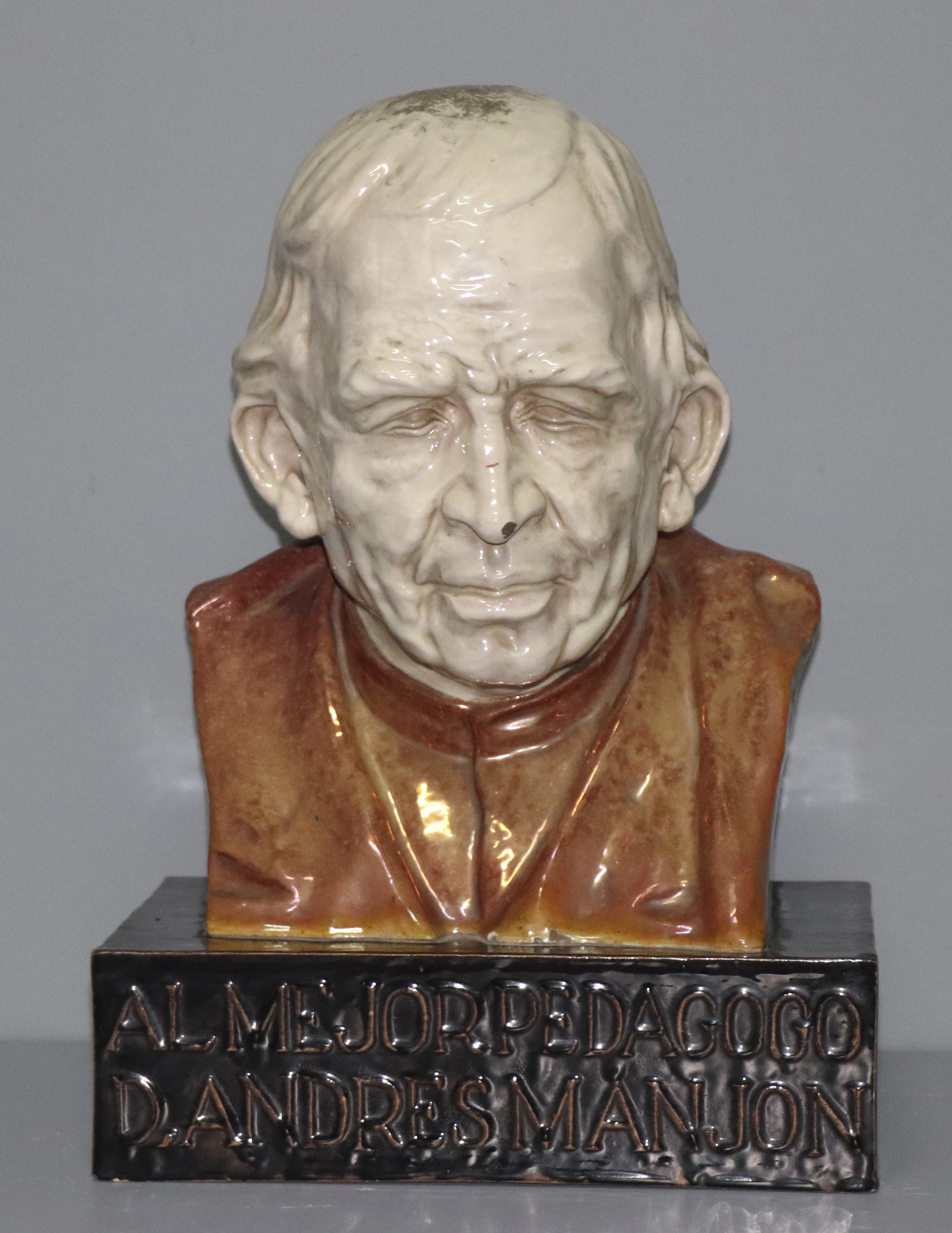 Busto escultórico modelado en arcilla y acabado en esmalte blanco las carnaciones y esmalte con reflejo metálico los ropajes. Se encuentra sobre una peana de cerámica esmaltada en negro. Representa al burgalés Andrés Manjón de avanzada edad. Al igual que otros bustos realizados por Morales Alguacil, muestra un cuidadoso tratamiento de la anatomía del rostro, logrando infundirle un trasfondo psicológico.