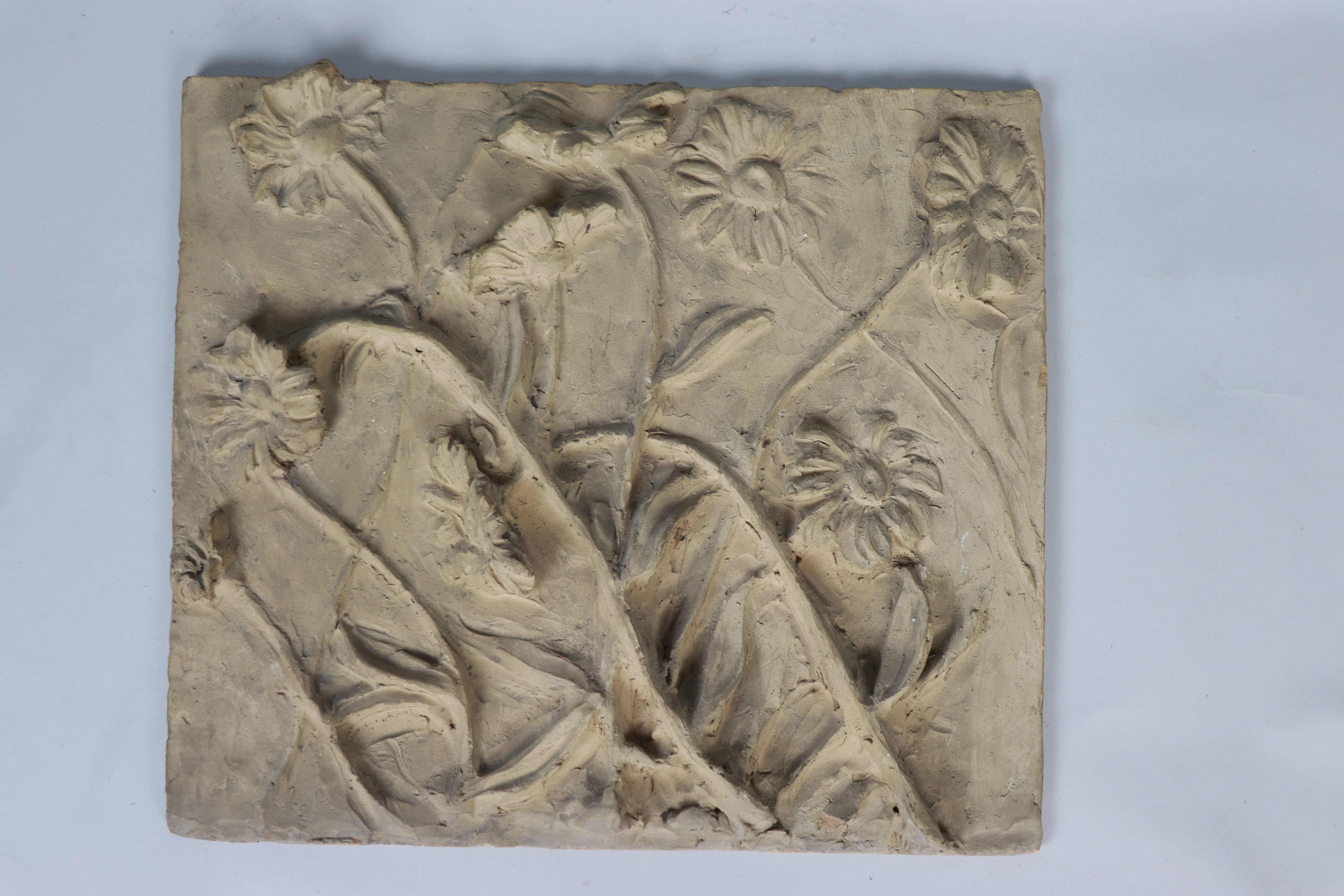 Este relieve, modelado en arcilla y terminado en bizcochado, representa una escena con margaritas en la que destaca el naturalismo con el que están ejecutadas las flores, cualidad que posteriormente quedará reflejada en su obra cerámica.