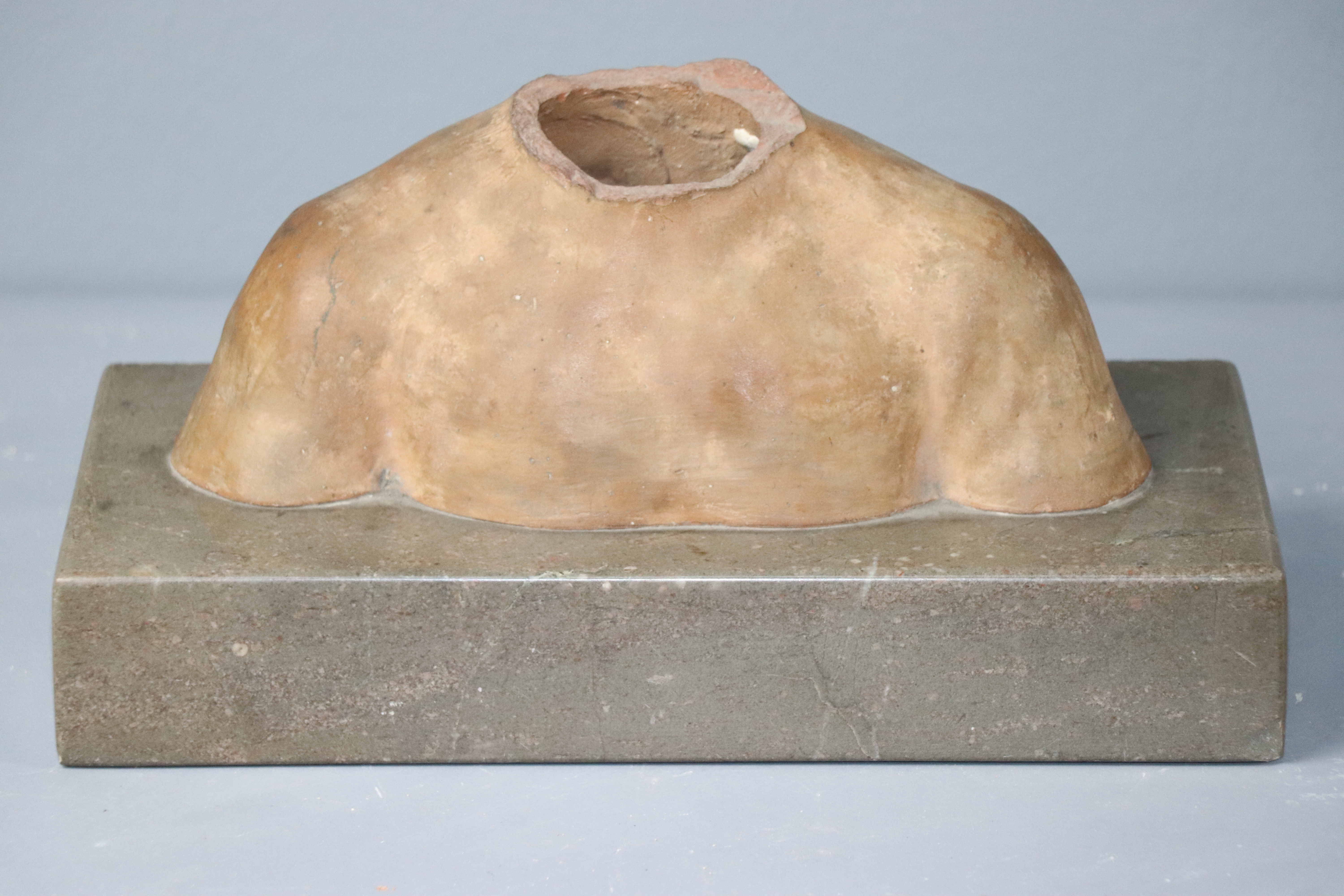 Busto escultórico modelado en arcilla y terminado en bizcochado que representa una figura humana sin cabeza. Al igual que otros bustos del maestro ceramista, se trata de una obra que refleja el estudio de la anatomía humana. Se encuentra sobre una peana de piedra de Sierra Elvira.