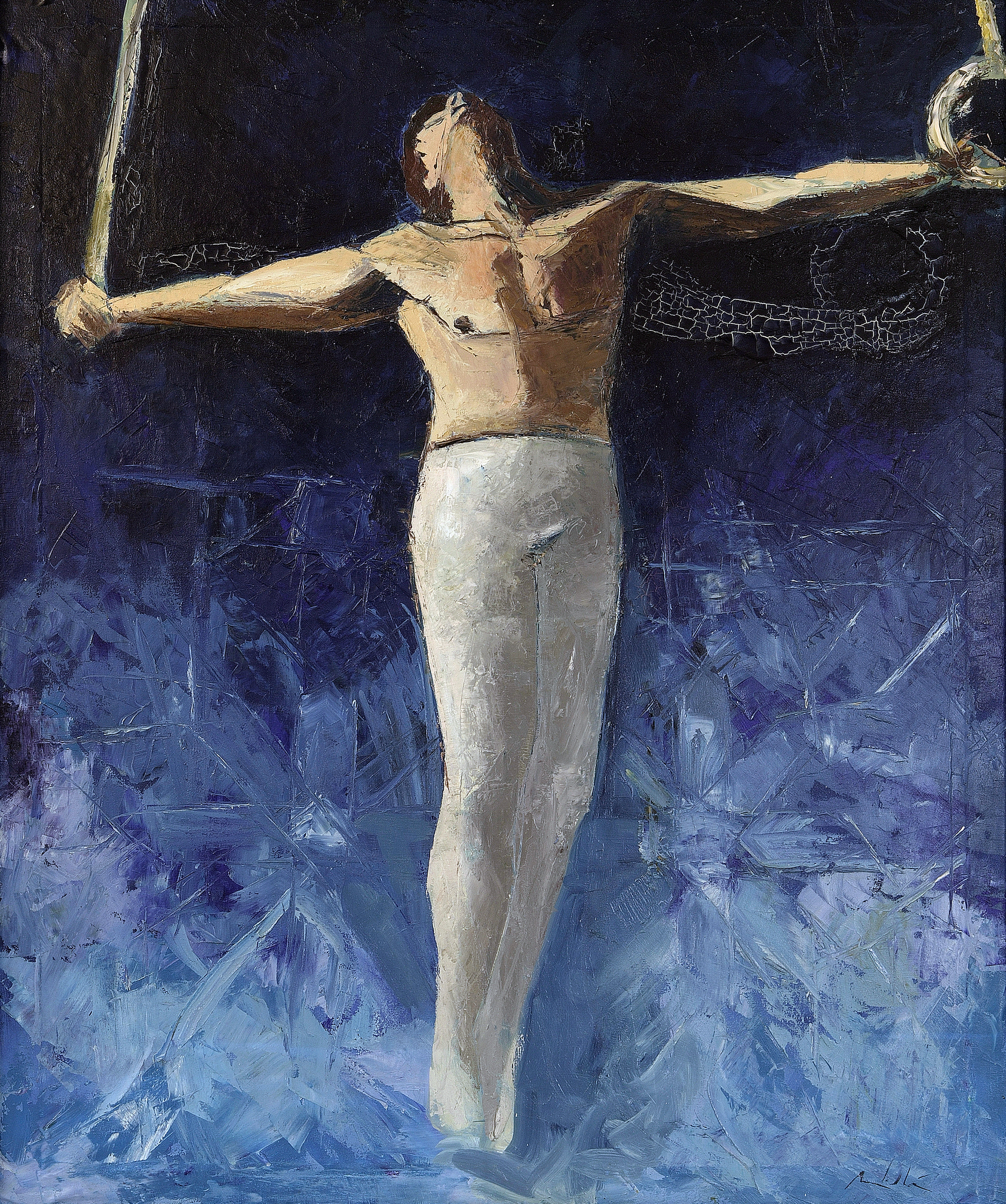 Composición que representa un gimnasta asido a las anillas mientras realiza la posición conocida como el "Cristo". La figura del protagonista supone un foco de luz en el lienzo y se recorta sobre un fondo graduado en tonalidades azuladas de intensidad ascendente que parte del celeste en el área inferior de la composición para alcanzar el azul ultramar en la superior.