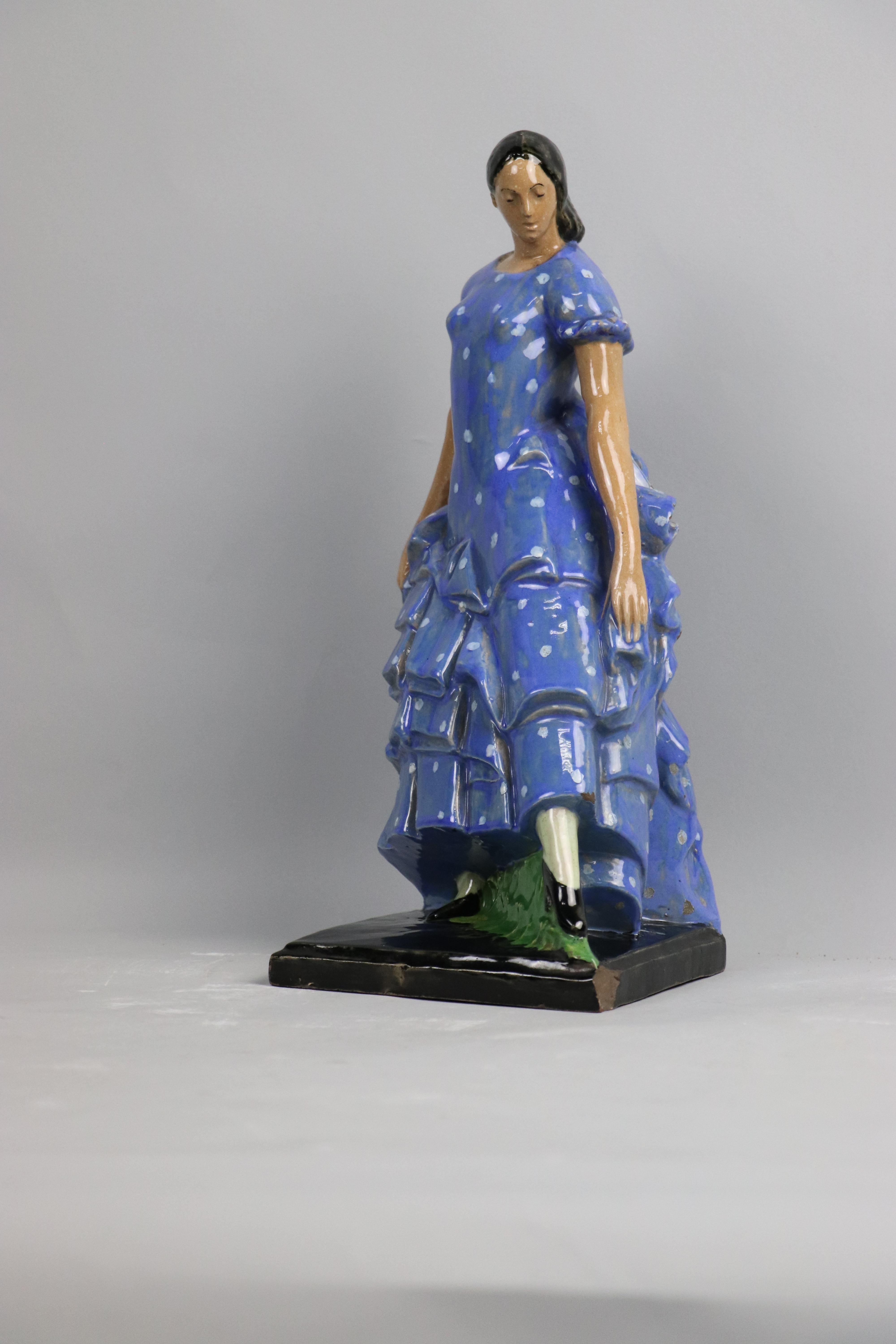 Escultura de bulto redondo realizada a partir del molde CAM00266.00.00, bizcochada y recubierta de esmalte, que representa la figura de una mujer con el atuendo típico de gitana. Así pues, al igual que en otras esculturas del artista, se aprecia la voluntad por mostrar la imagen prototípica del costumbrismo español, y por ende andaluz, asociado al mundo del flamenco. Además, destaca el buen tratamiento de las proporciones, así como el detalle de los pliegues del vestido azul.
