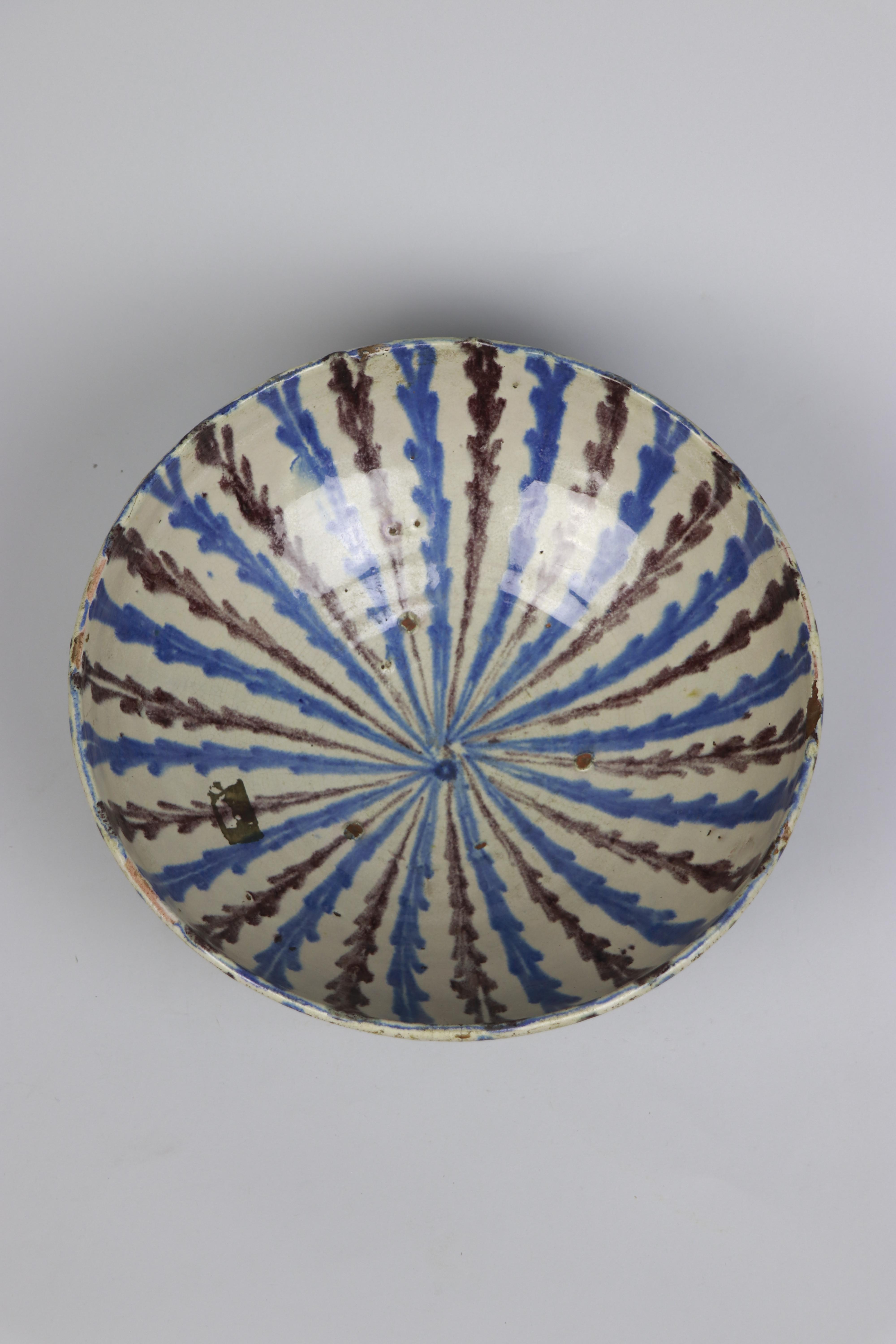 Cuenco modelado en arcilla, torneado en pella y horma, y esmaltado en blanco con bandas geométricas de color marrón (logrado mediante la aplicación óxido de manganeso) y azul (procedente del cobalto) a modo de palmillas. Probablemente, al igual que la mayoría de las cerámicas de la época, tuviera un fin doméstico o decorativo.