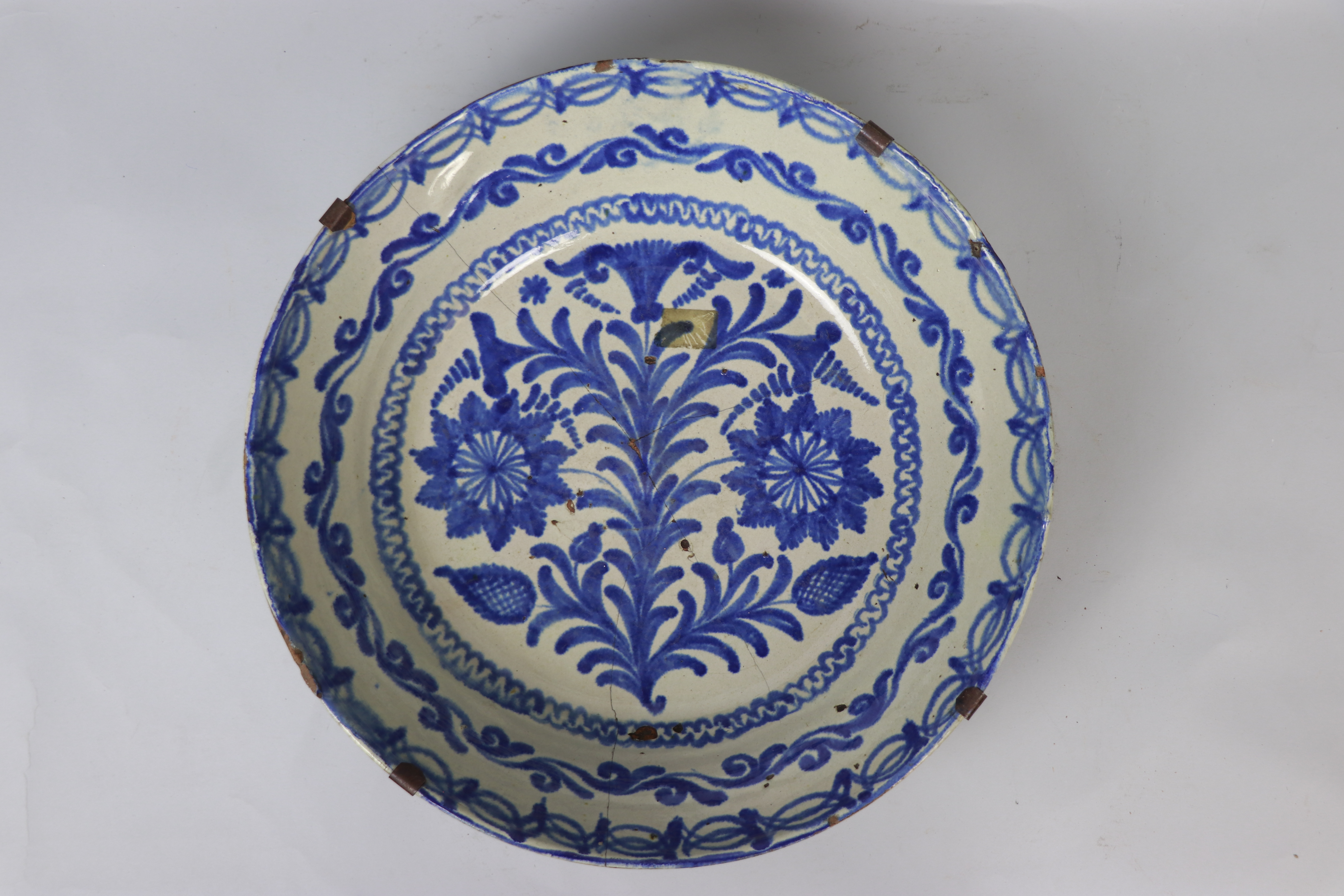 Fuente semillana que presenta una torta llana, como base, alas inclinadas y borde recto. Está realizada en arcilla torneada en pella de arcilla común y horma, esmaltado en blanco, con monococción en horno árabe, y decoración repintada monócroma en azul cobalto.