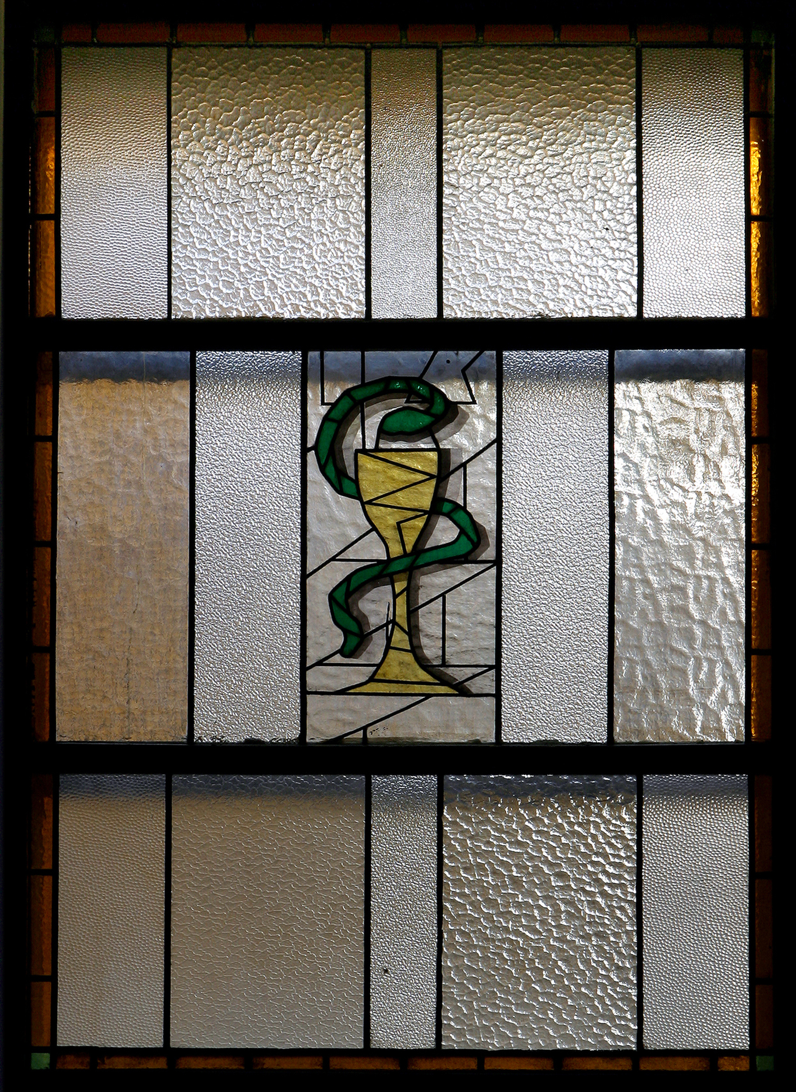 Vidriera compuesta por tres secciones horizontales superpuestas, divididas en piezas rectangulares de vidrio esmerilado con diferentes texturas y, en el recuadro central, una representación que contiene el diseño de la copa de Higía, emblema de la Facultad de Farmacia. La copa está realizada con varias piezas de vidrio amarillo, destacando sobre ésta, en verde, la serpiente que se enrosca en el fuste de la copa.
