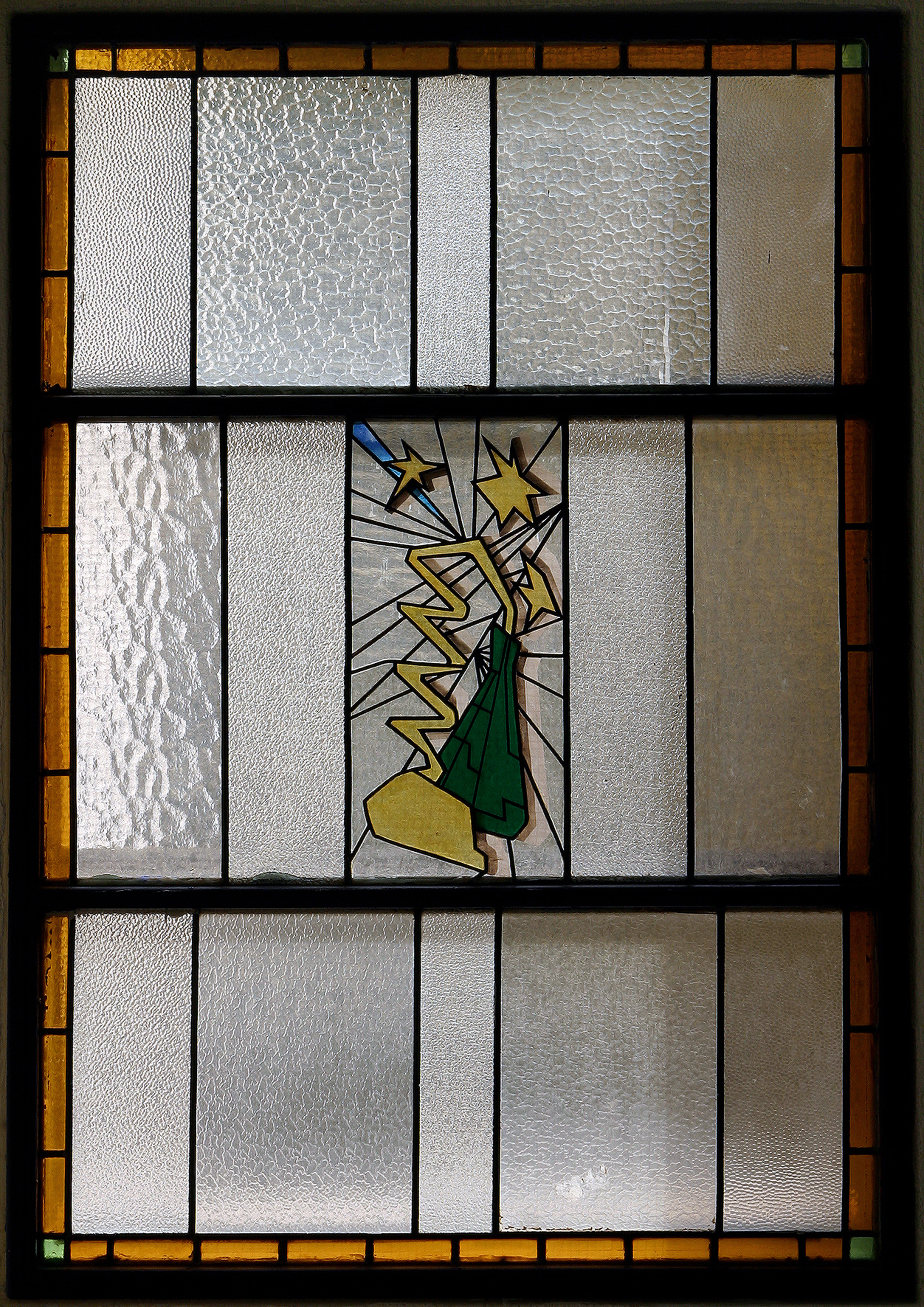 Vidriera compuesta por tres secciones horizontales superpuestas, divididas en piezas rectangulares alternando vidrios esmerilados de diferentes texturas y, en el recuadro central, el diseño de un destilador. Las formas redondeadas son sustituidas por líneas rectas negras resultantes del emplomado de vidrio, contrastando el cromatismo basado en tonos verde y amarillo del instrumento con el fragmentado fondo blanco. El conjunto se enmarca en una cenefa anaranjada con cuadros verdes en los ángulos.