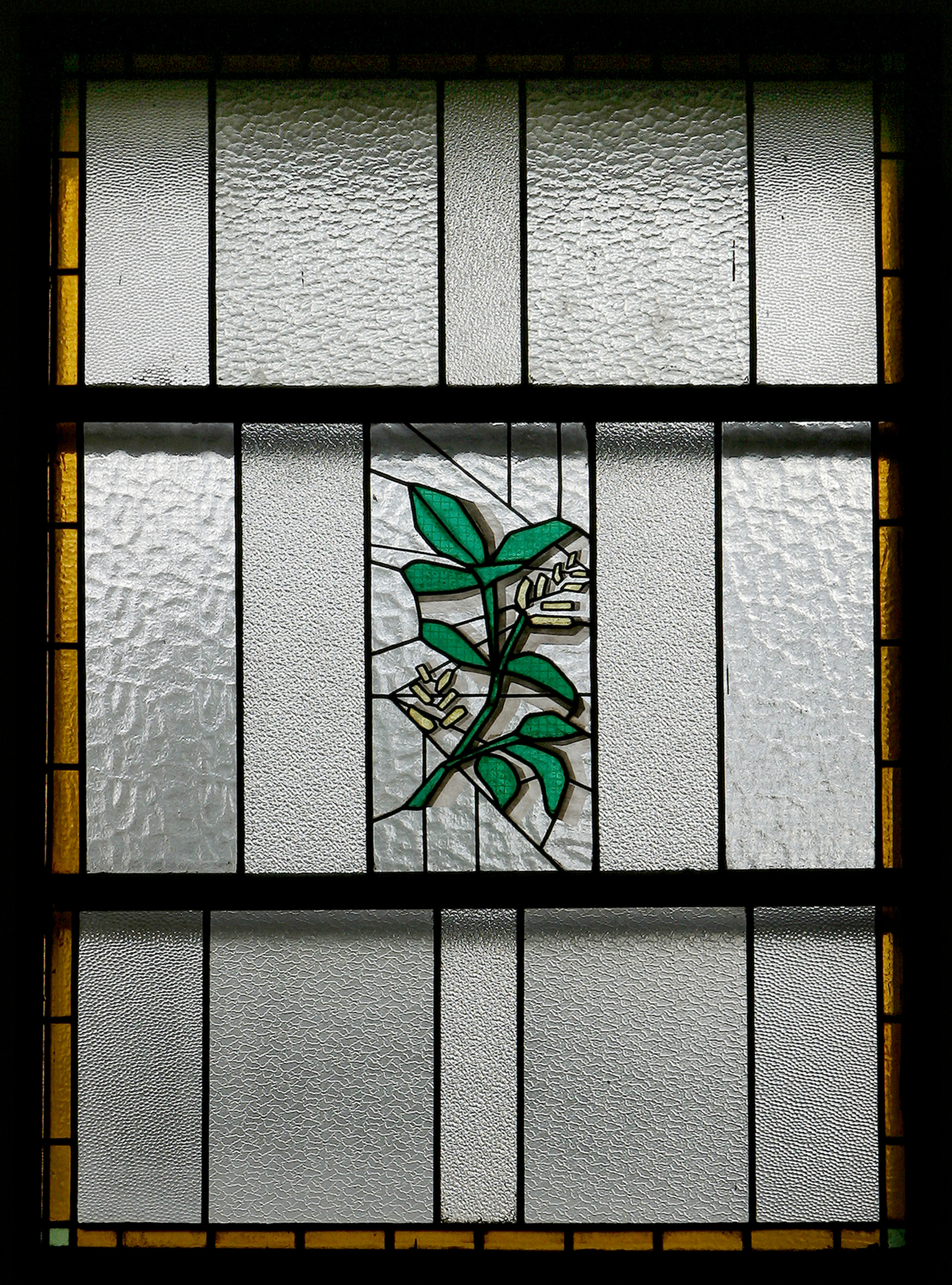 Vidriera compuesta por tres secciones rectangulares horizontales superpuestas, divididas en piezas de diferentes texturas que alternan vidrios traslúcidos y blancos. La mineralogía aparece representada en el rectángulo central mediante el esquemático diseño de una formación cristalina de piezas alargadas, coloreadas en amarillo sobre una base verde. El fondo blanco plano aparece fragmentado conformando una maraña de pequeños vidrios poligonales. El conjunto se enmarca en una cenefa de color anaranjado con cuadros verdes en los ángulos.