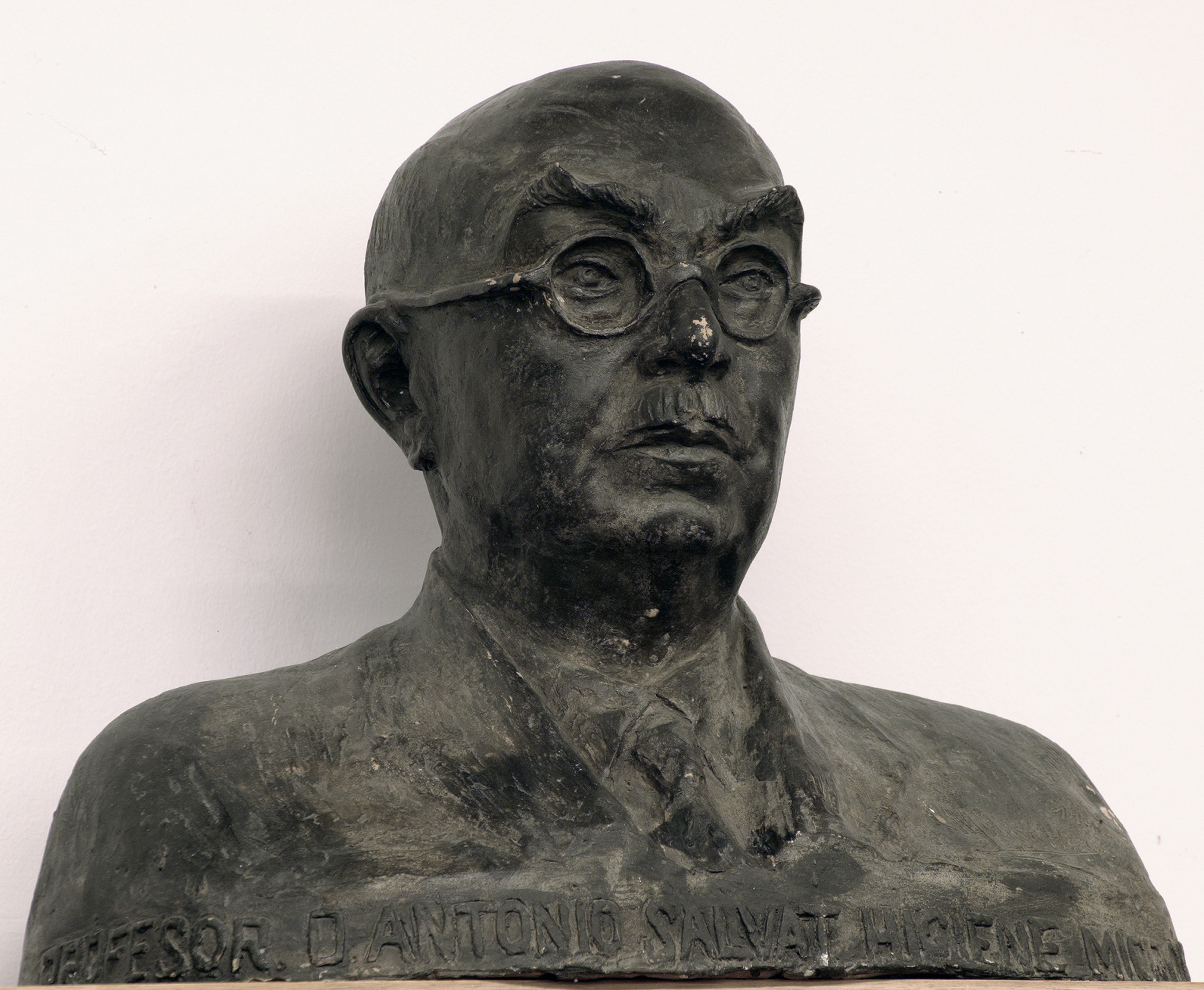 Busto en yeso policromado imitando bronce del conocido médico Antonio Salvat Navarro, con gafas redondas y traje. La obra está fechada y firmada por su autor, "1941 / L. Molina de Haro", en la solapa de la chaqueta. Además, bordeando la base de la escultura presenta la siguiente leyenda: "PROFESOR D. ANTONIO SALVAT HIGIENE MICROBIOLOGIA"