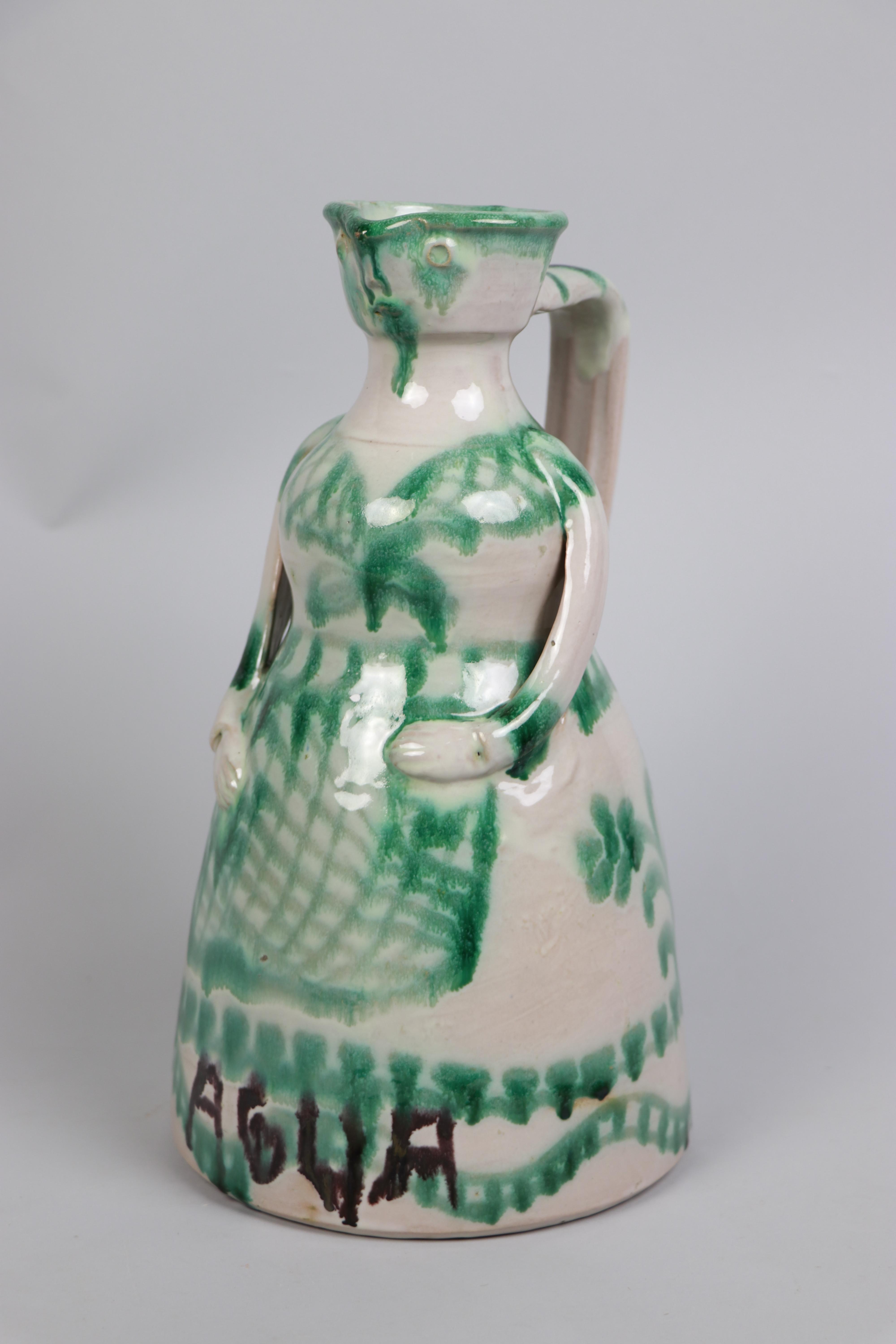Jarra de cerámica modelada en arcilla, torneada en pella chica, bizcochada y esmaltada en blanco con decoración repintada monocroma en verde. Aprovechando la propia forma de la jarra se le ha dado aspecto antropomórfico, en la boca de la cerámica se ha dibujado la cara, el cuello se ha aprovechado para hacer el torso femenino, pues incluso se le ha puesto unos brazos saliendo de la parte superior del cuello de la jarra y el cuerpo de ésta hace de falda de la figura femenina. En la zona inferior podemos ver la palabra "agua".