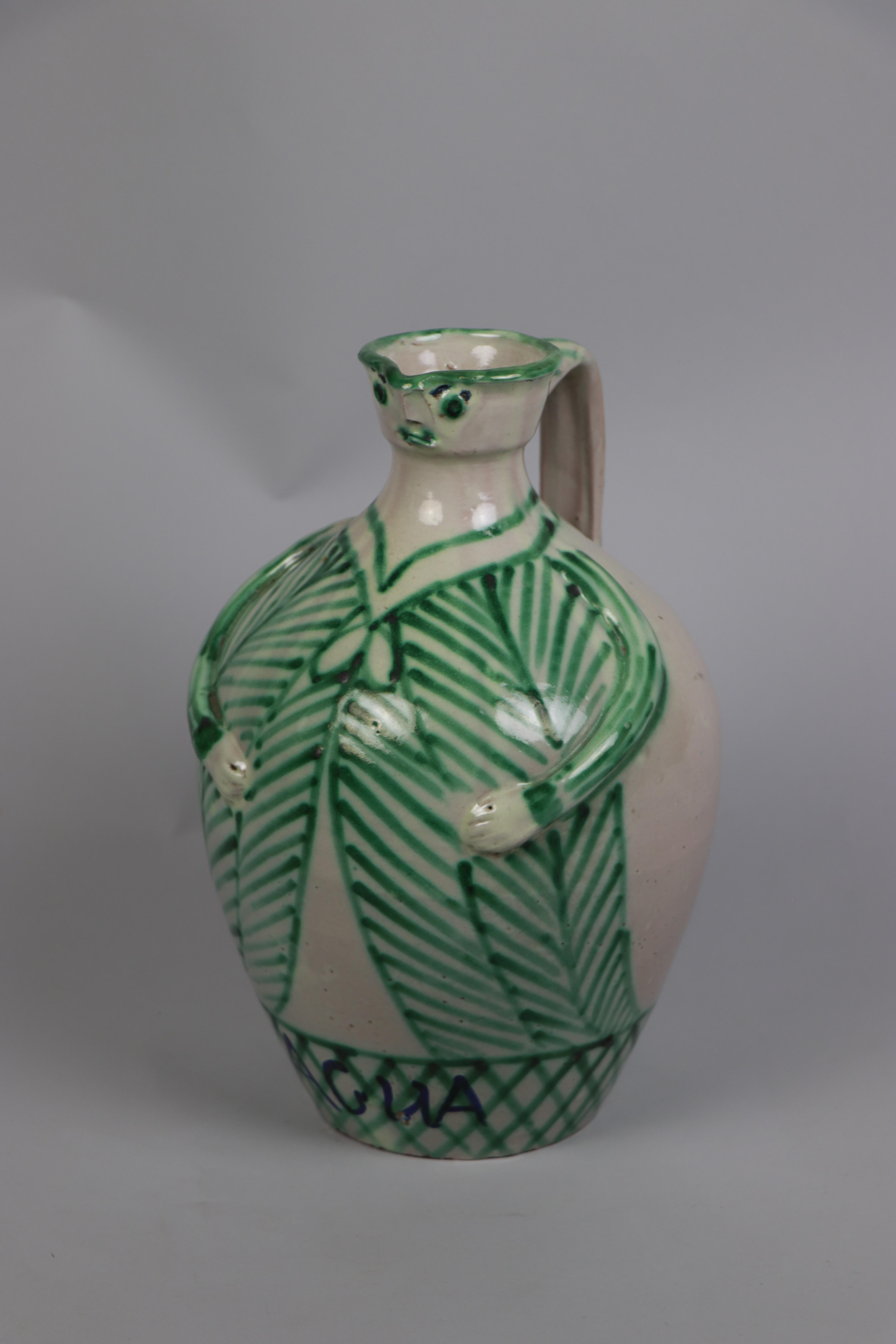 Jarra de cerámica modelada en arcilla, torneada en pella chica, bizcochada y esmaltada en blanco con decoración repintada monocroma en verde. Aprovechando la propia forma de la jarra se le ha dado aspecto antropomórfico, en la boca de la cerámica se ha dibujado la cara y el cuerpo de jarra se ha aprovechado como cuerpo de la figura. La vestimenta se ha realizado en verde y en la parte inferior aparece la palabra "agua".