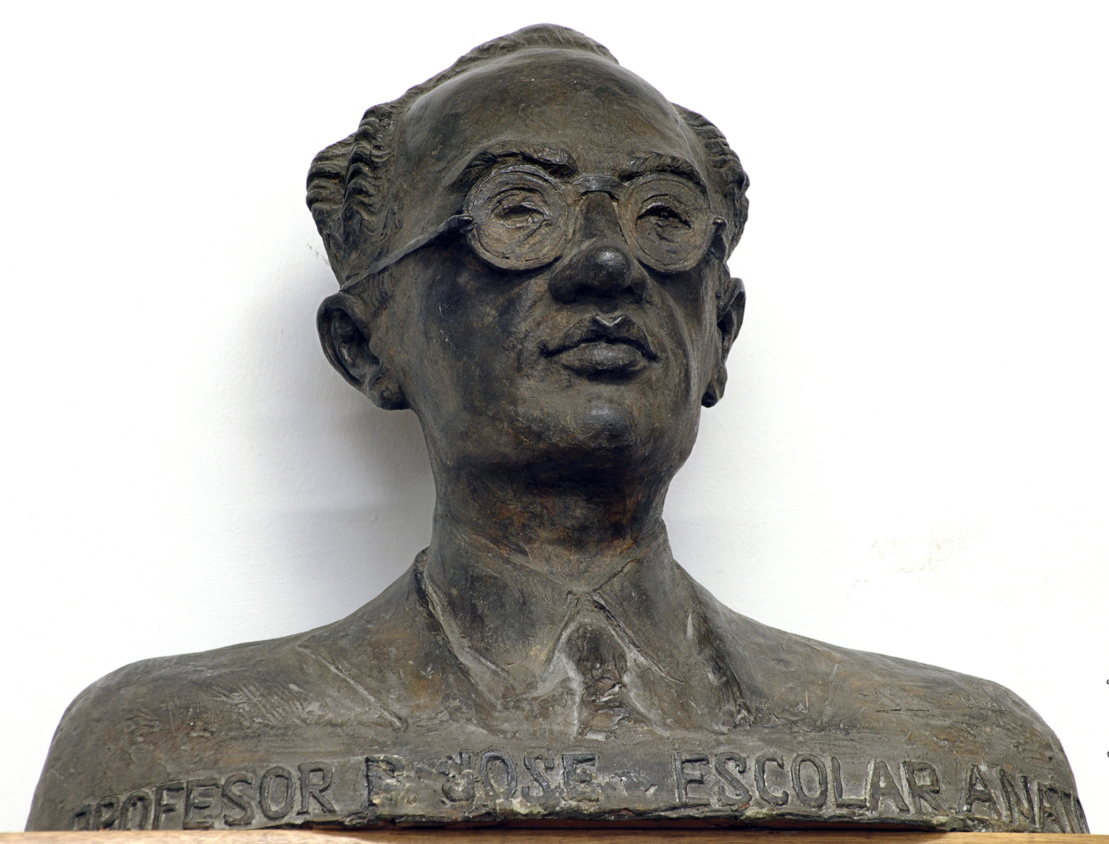 Busto en barro policromado imitando bronce, viste chaqueta y corbata, con gafas redondas y pelo echado hacia atrás. Presenta una inscripción bordeando la base, "PROFESOR D.JOSE ESCOLAR ANATOMIA".