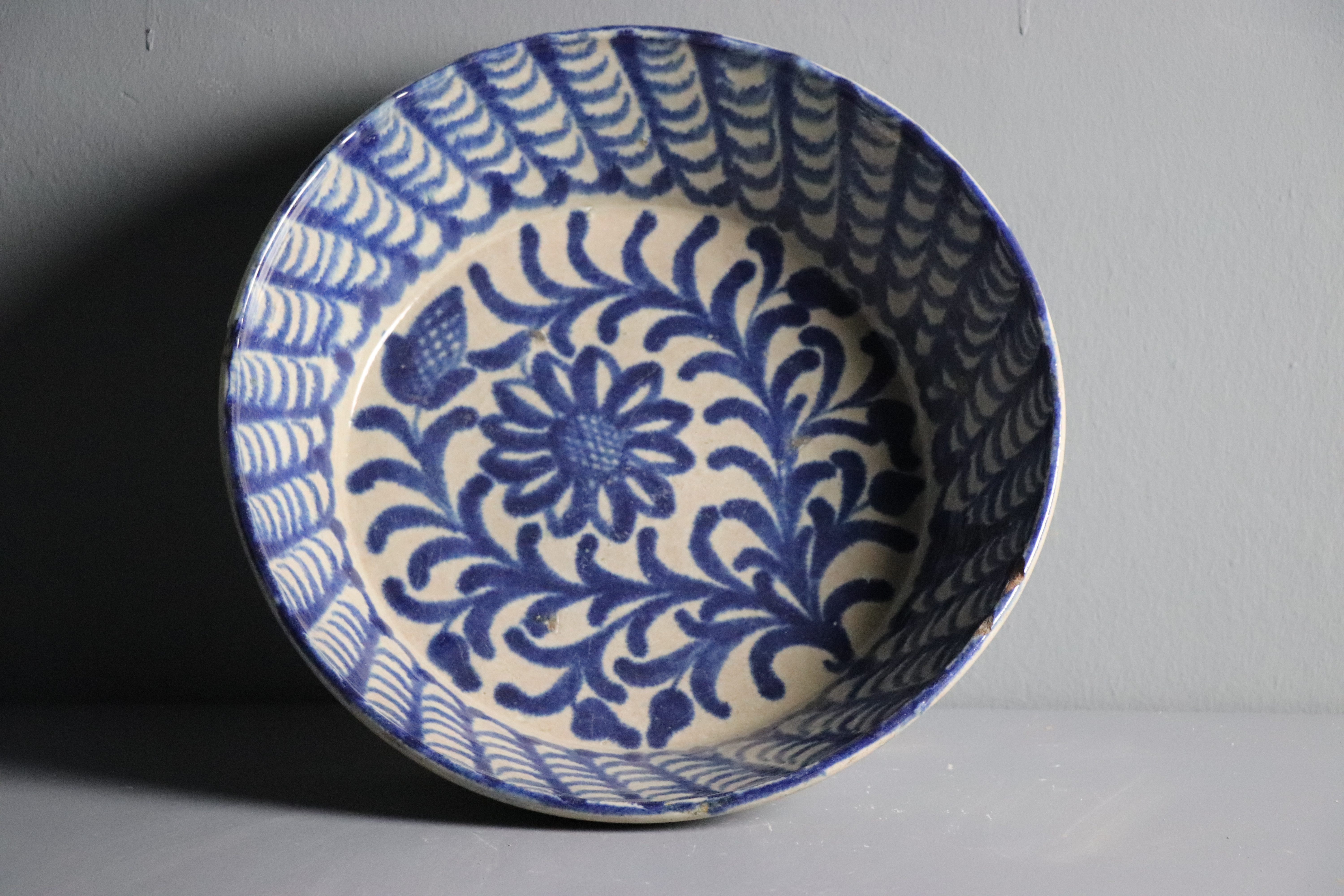 Fuente semillana modelada en arcilla, torneada en pella y horma y esmaltada en blanco, repintada con decoración monocroma azul cobalto.