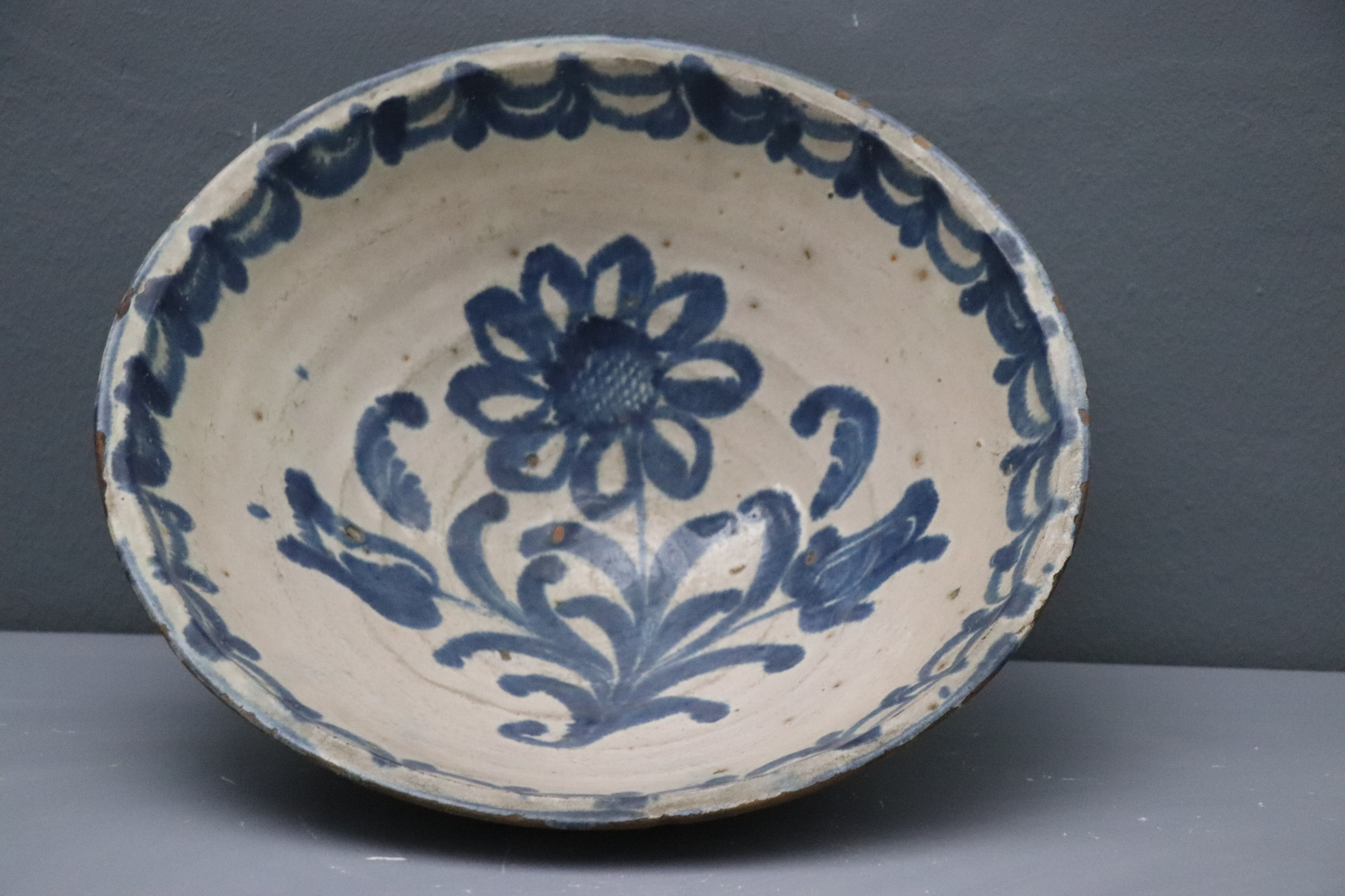 Tazón de cerámica granadina modelado en arcilla, torneado en pella y horma y esmaltado en blanco con decoración corriente monocroma en azul cobalto.