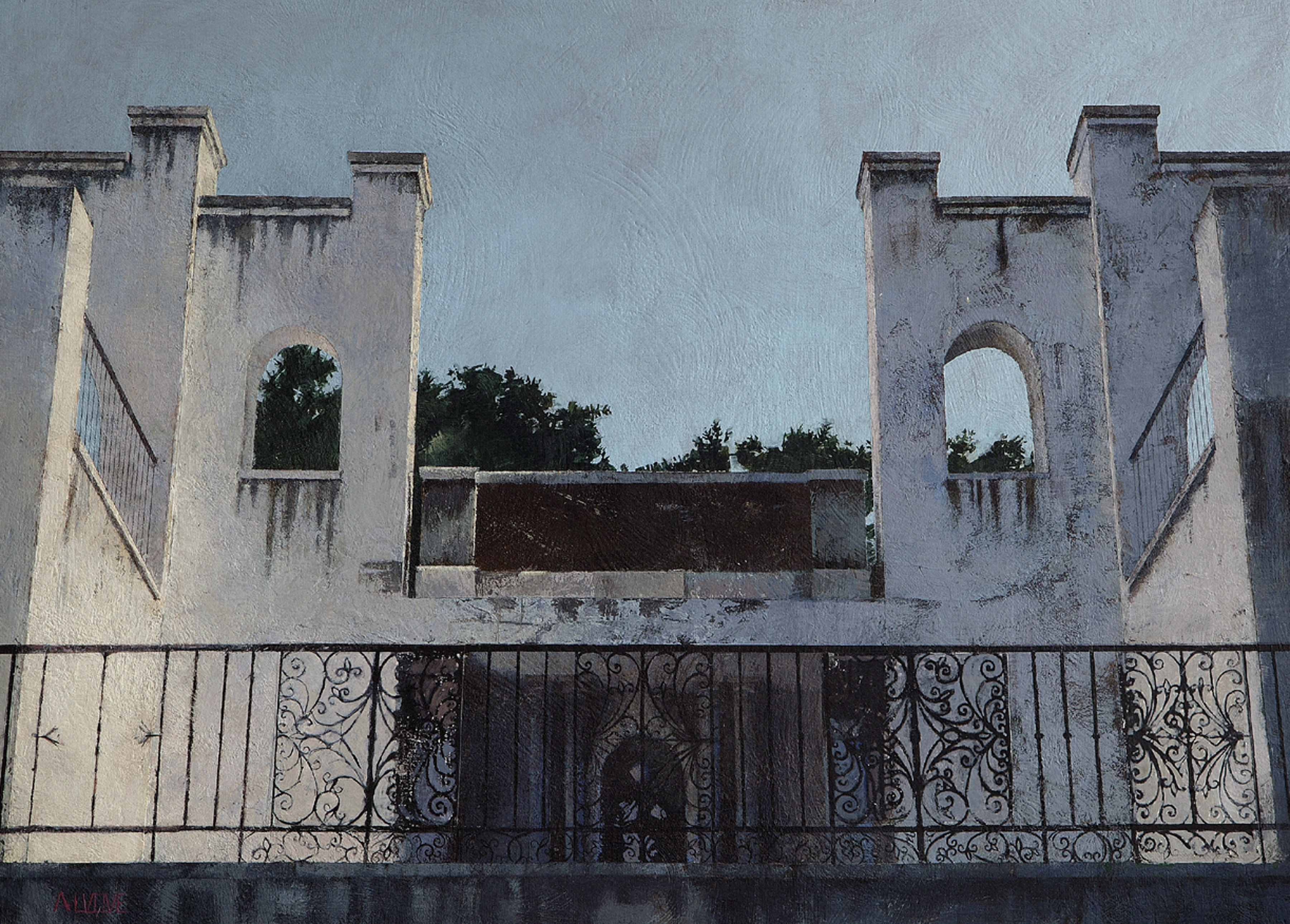 El autor ha reproducido uno de los rincones del Carmen de la Fundación Rodríguez-Acosta, concretamente de la parte superior del jardín del Estanque de Venus. El recurso arquitectónico está planteado desde una fuerte perspectiva inferior, de tal manera que las formas ortogonales de blancura contrastada se recortan sobre un cielo de gran efecto. La composición resulta así de un gran clasicismo, de una profunda serenidad con fuerte capacidad de evocación.