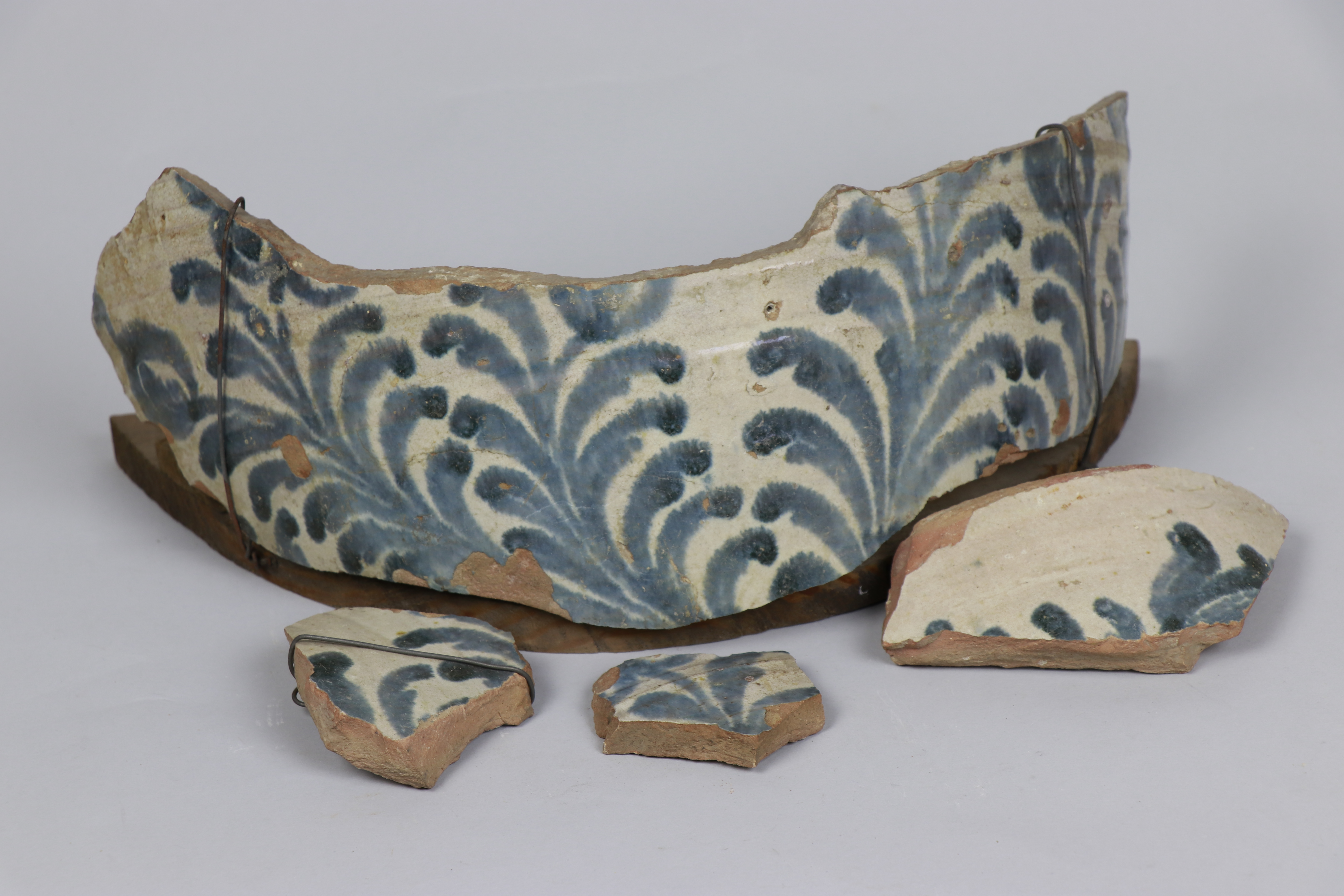 Cuatro fragmentos de la panza de una orza modelada en arcilla y esmaltada en blanco con decoración en azul cobalto de motivos vegetales.