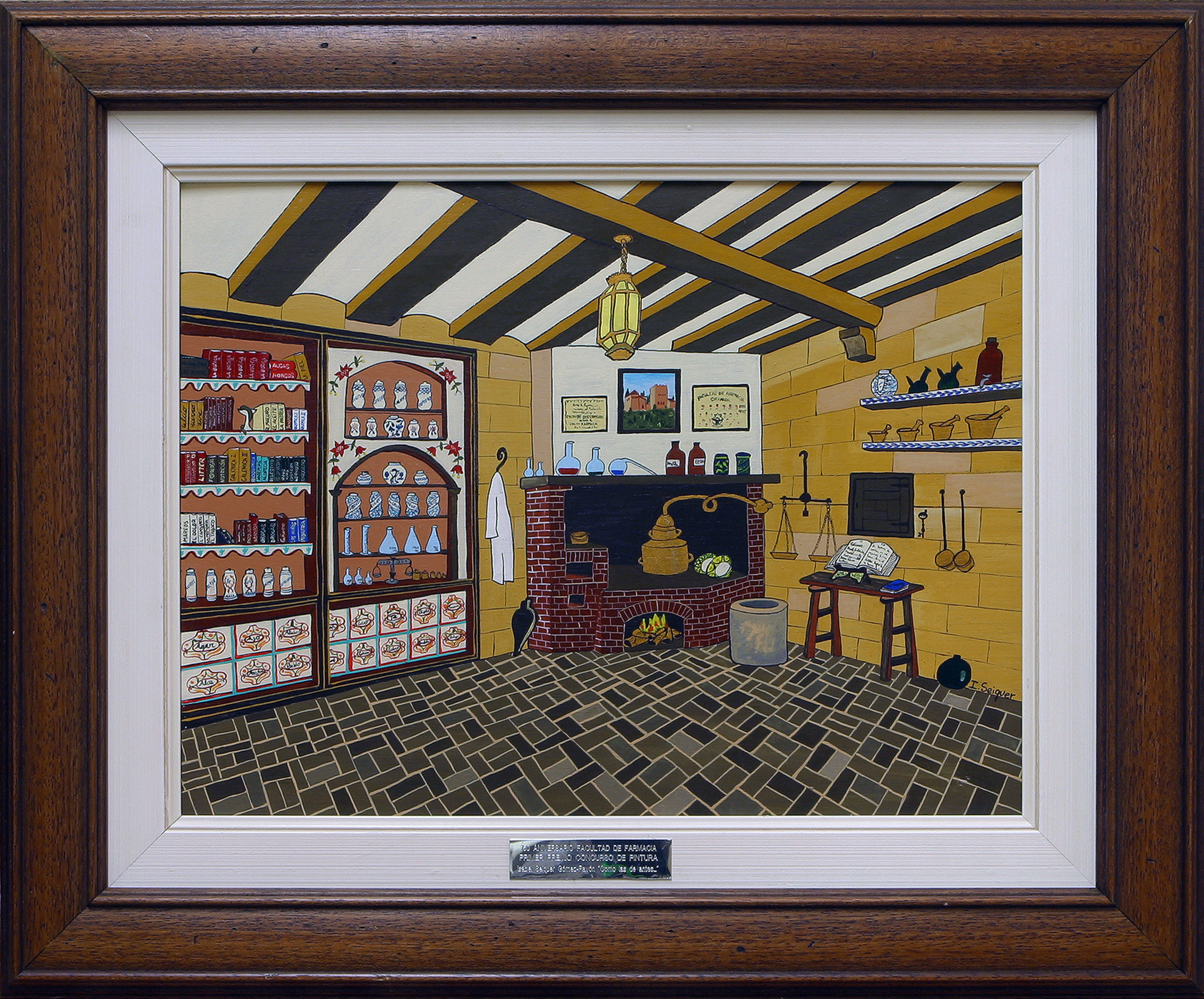 Se trata del interior de una antigua farmacia con techo de bovedillas apoyadas en vigas de madera, del que cuelga un farol granadino. El suelo es de losas grises que generan una perspectiva ligeramente forzada y las paredes de piedra ocre. El encuadre elegido muestra dos vanos de la estancia con una chimenea que genera un chaflán en el rincón de ambos. encendida con un alambique dentro y otro instrumental farmacéutico en la repisa. Mientras tanto, en la pared izquierda, hay estanterías con libros, utensilios e instrumental farmacéutico. Sobre la chimenea se pueden ver una serie de diplomas y un cuadro que representa La Alhambra de Granada.