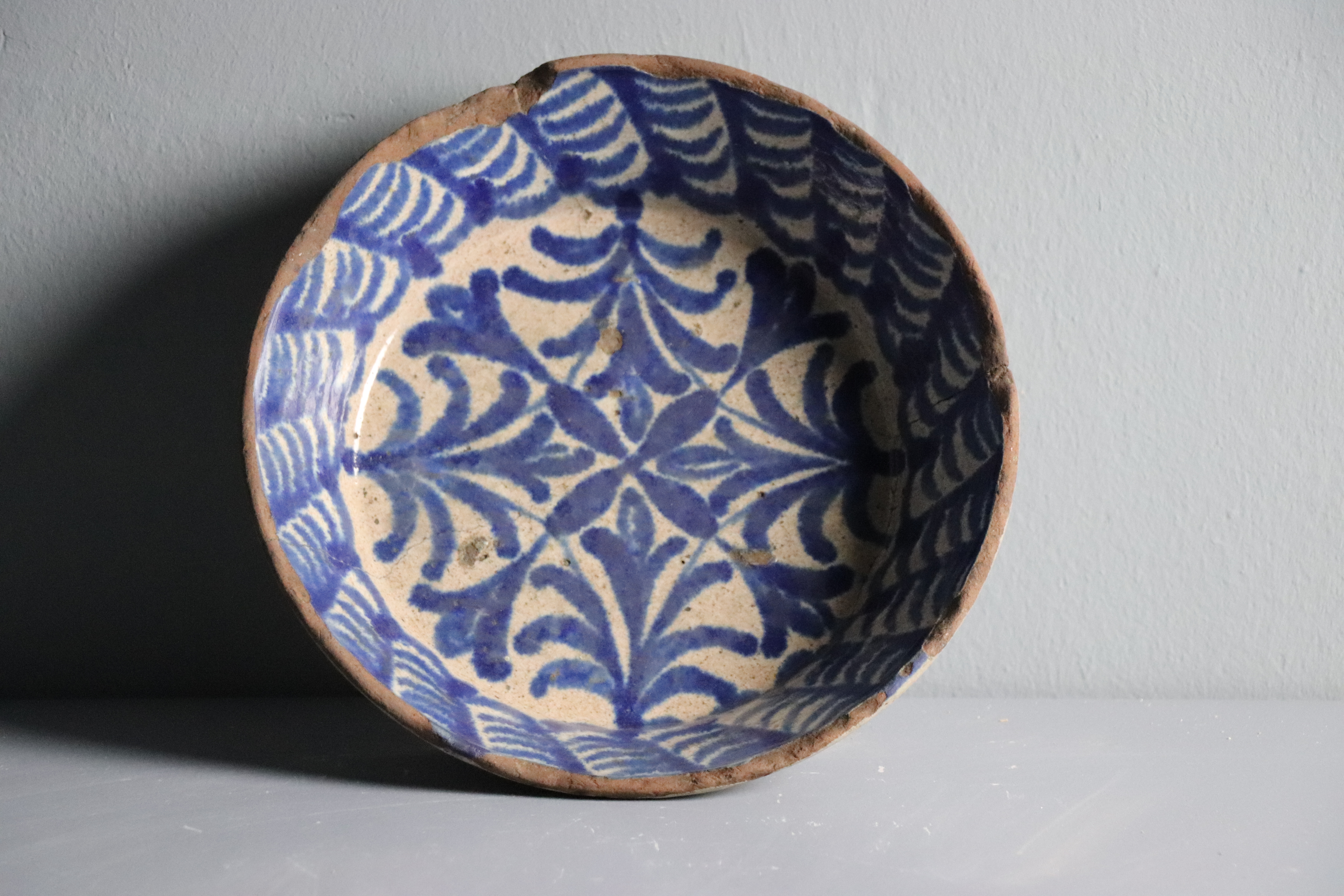 Fuente semillana modelada en arcilla, torneada en pella y horma y esmaltada en blanco con decoración corriente monocroma en azul cobalto.