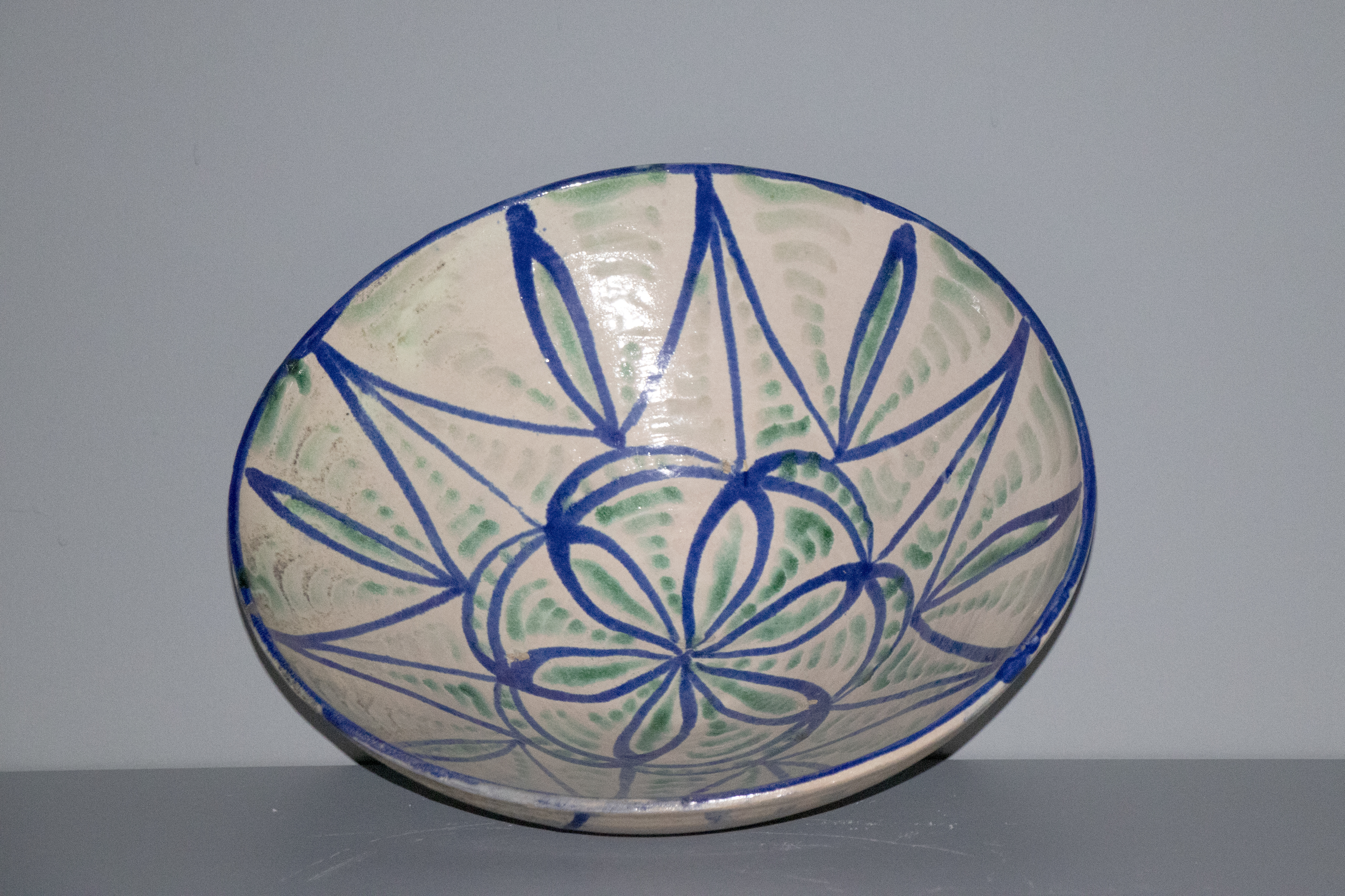 Tazón modelado en arcilla, torneado en pella y horma y esmaltado en blanco con decoración repintada monocroma en azul cobalto y verde de óxido de cobre.