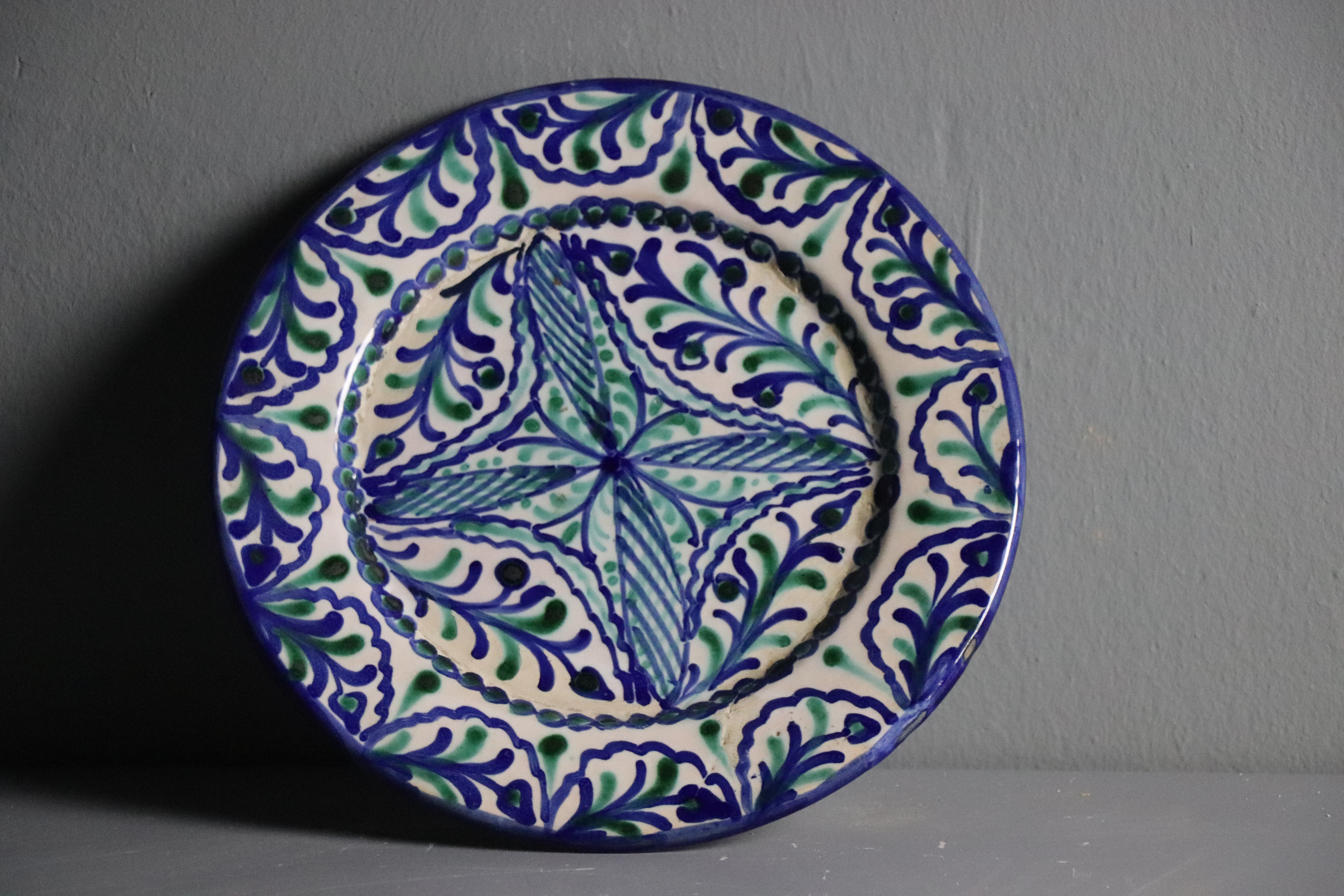 Plato modelado en arcilla, torneado en pella y horma y esmaltado en blanco con decoración repintada en azul cobalto y verde de óxido de cobre.
