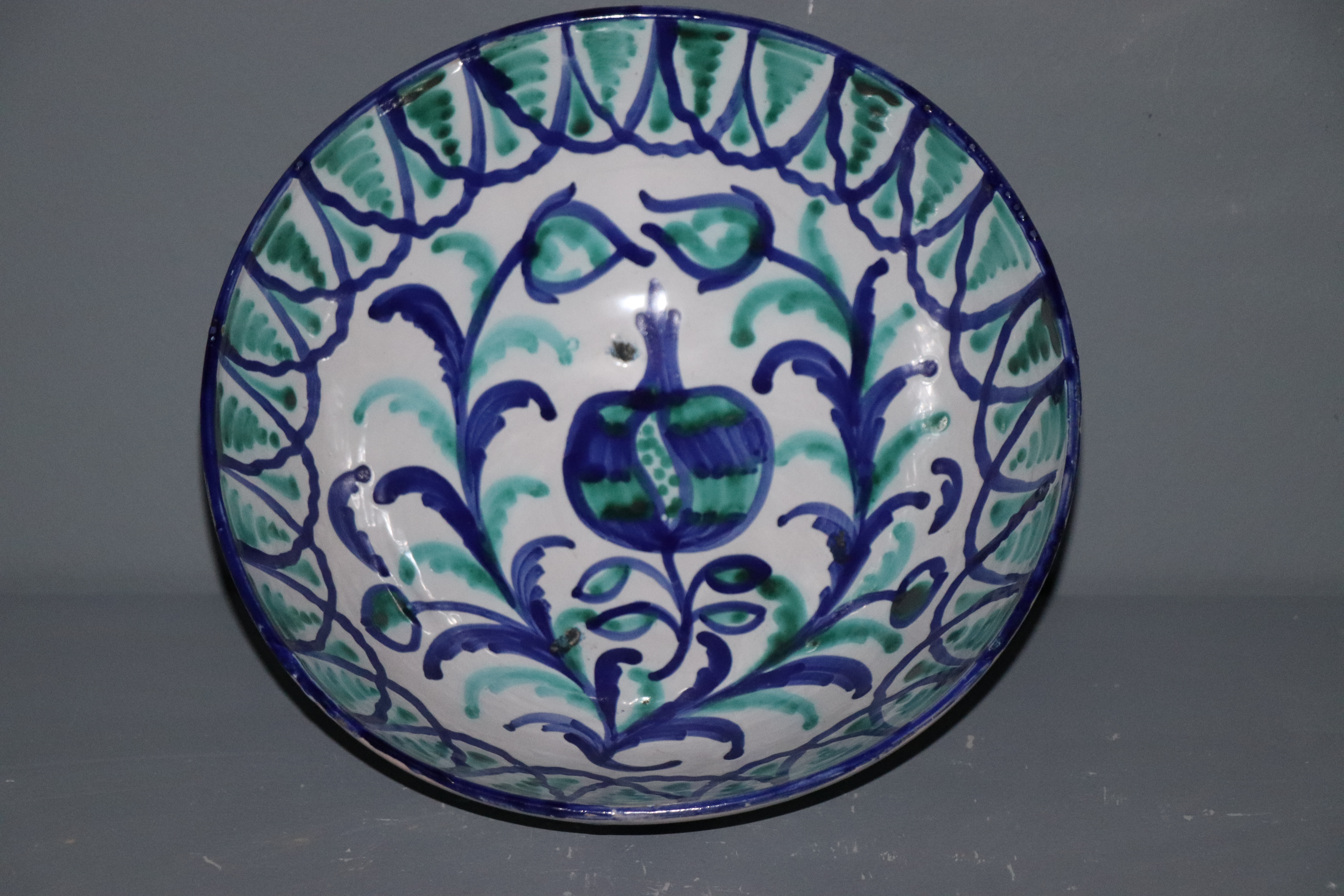 Tazón de cerámica granadina modelado en arcilla, torneado en pella y horma y esmaltado en blanco con decoración repintada en azul cobalto y verde óxido de cobre.