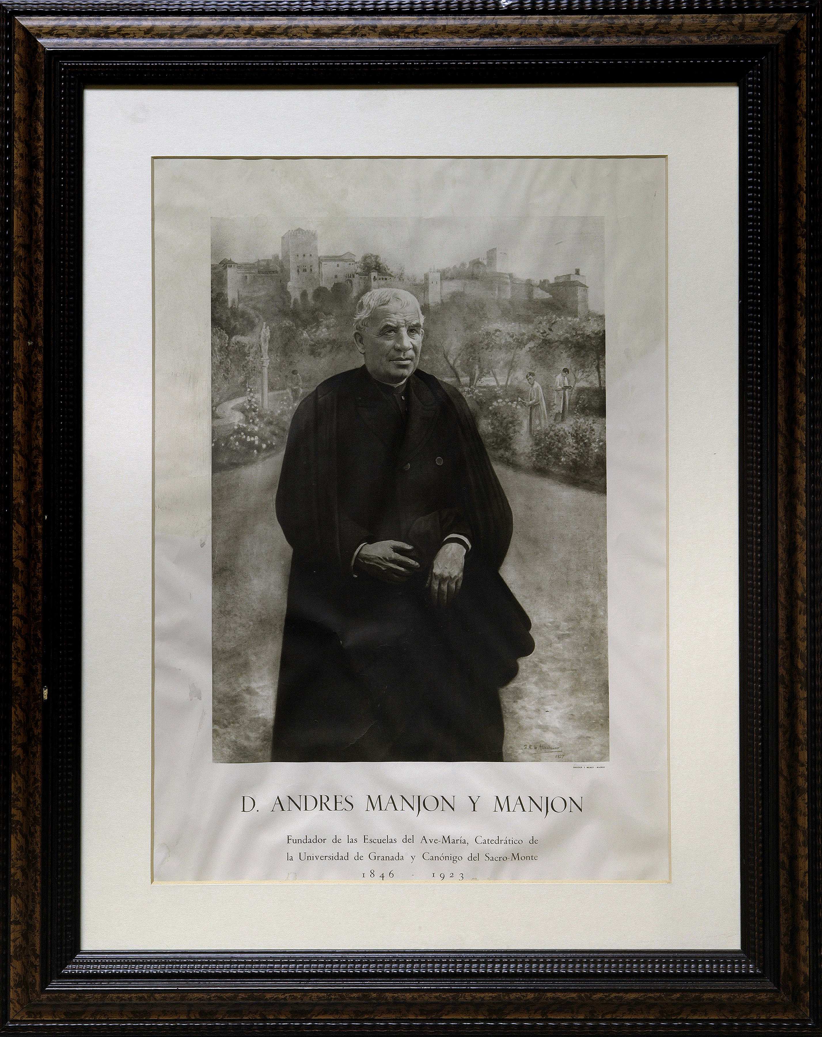 Aparece posando en un jardín donde se ve a tres chicos leyendo y como fondo de la escena se observa la Alhambra. Bajo la fotografía aparece la siguiente inscripción: "D. ANDRES MANJON Y MANJON / Fundador de las Escuelas Ave-María, Catedrático de la Universidad de Granada y Canónigo del Sacro-Monte / 1843-1923"