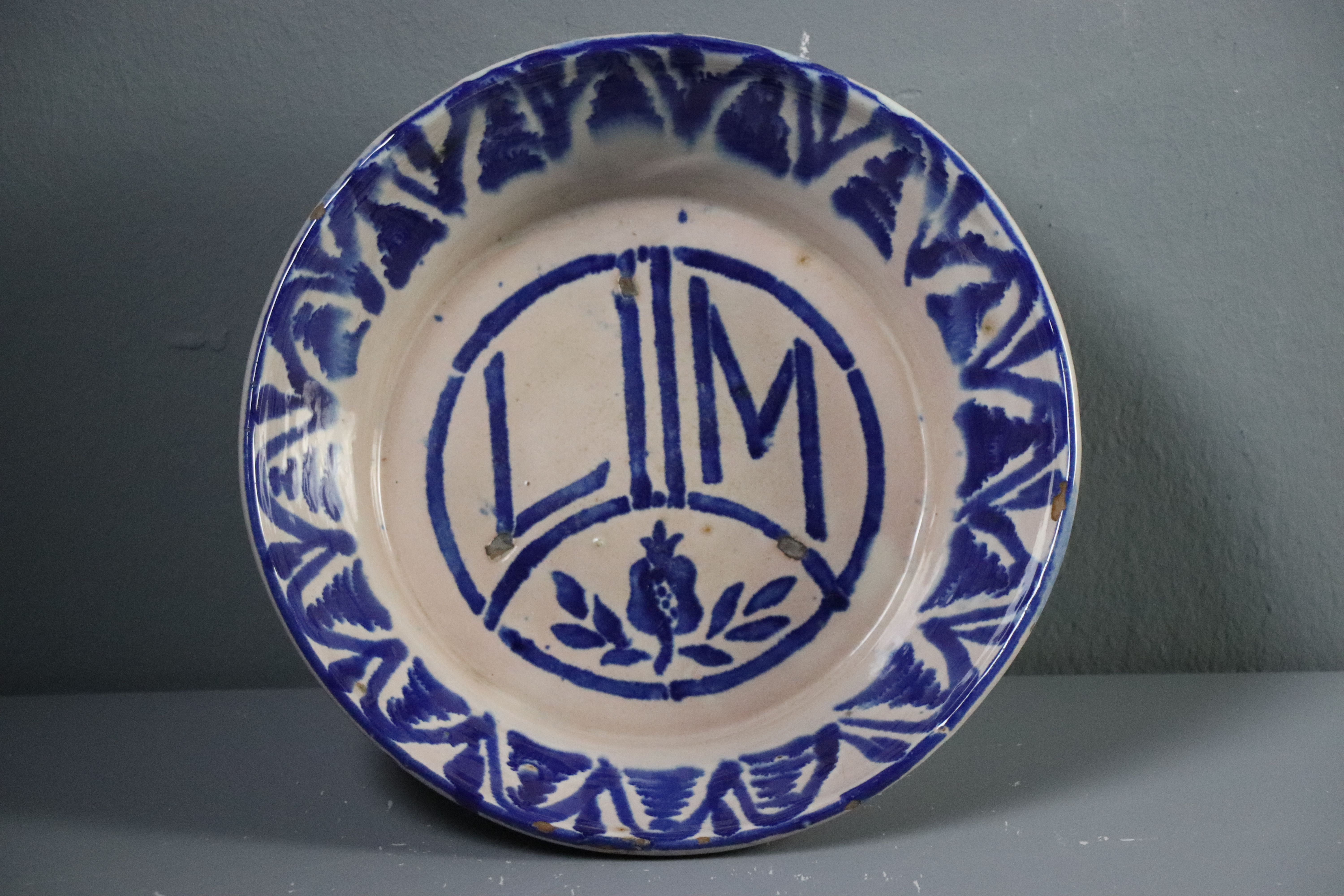Fuente semillana llana de cerámica granadina torneada en pella y horma y esmaltada en blanco con decoración repintada monocroma en azul cobalto.