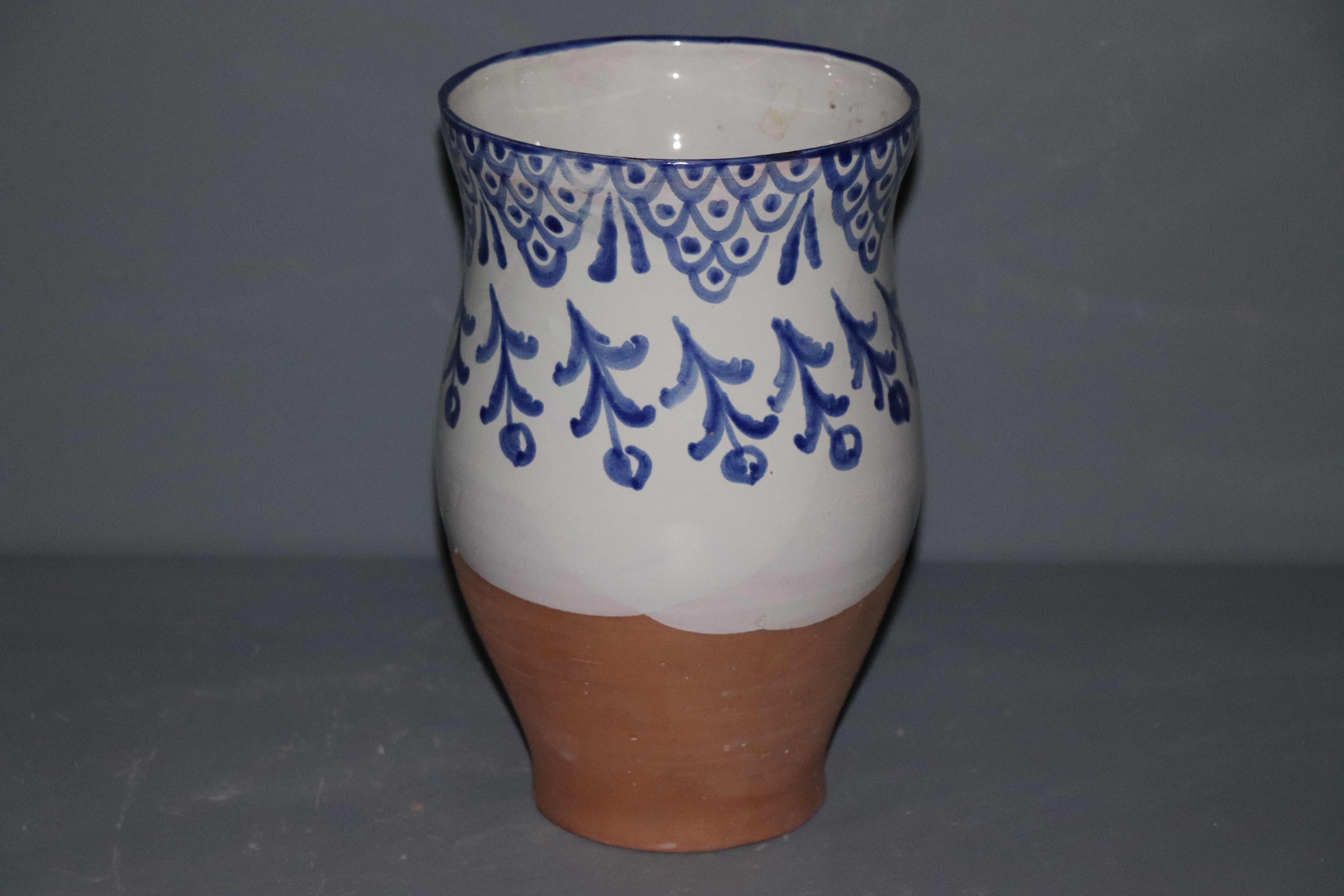Jarrón especial de cerámica granadina modelado en arcilla, torneado en pella chica y esmaltado en blanco en los dos tercios superiores, con decoración repintada monocroma en azul cobalto. El tercio inferior no presenta esmaltado, dejando ver la textura de la cerámica cocida al natural. La decoración repintada que ocupa la parte central del cuerpo presenta una sucesión de motivos vegetales, mientras que alrededor de la boca se encadenan racimos de uvas.