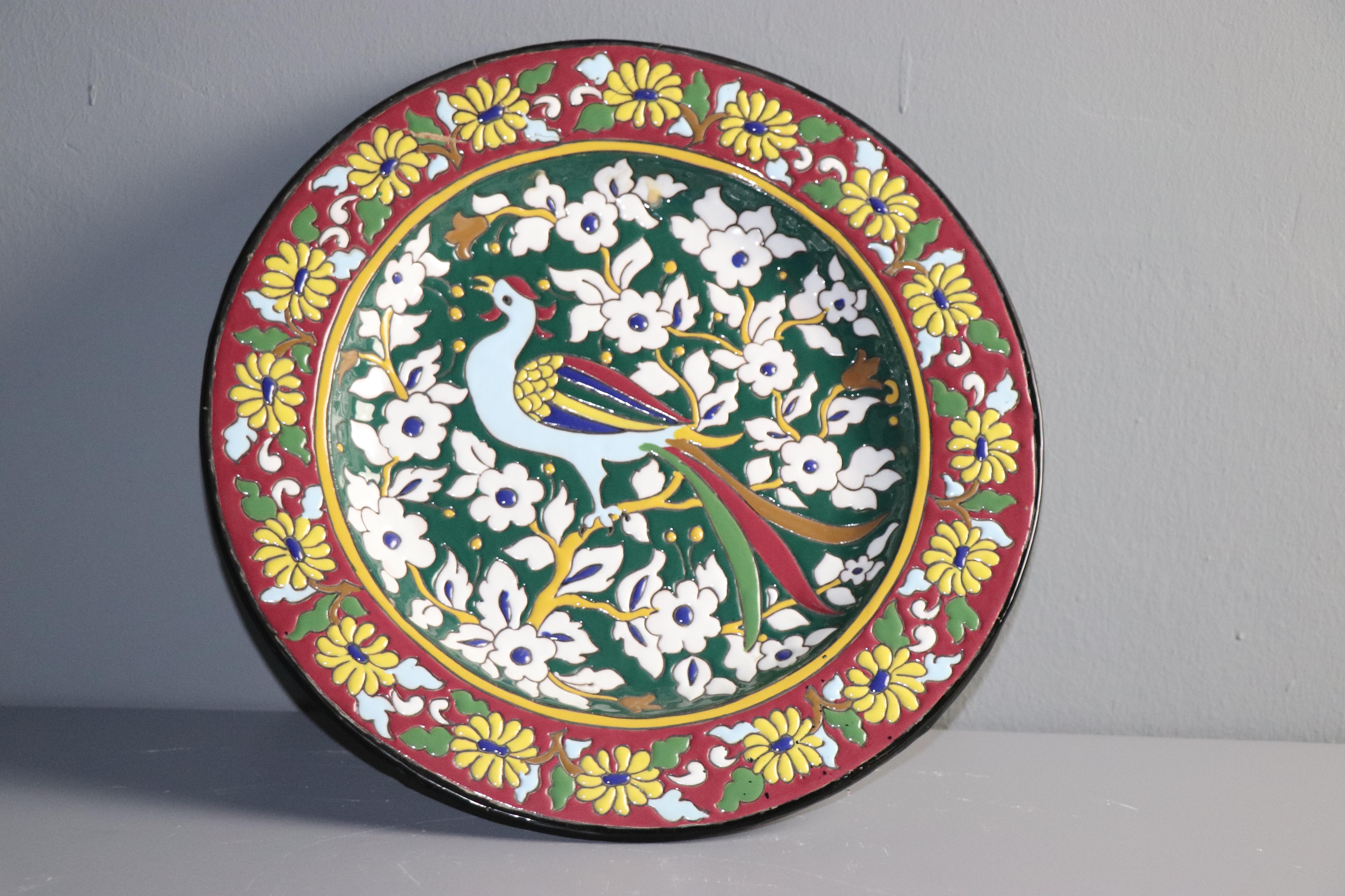 Plato de cerámica modelado en arcilla, torneado en pella y horma y esmaltado en cuerda seca en múltiples pigmentos, siguiendo la estética neo-árabe del siglo xx, en lo que respecta al gusto por retornar a los motivos de la tradición nazarí. En las alas del plato presenta una sucesión de motivos florales. Asimismo, la torta está dominada por un pavo real envuelto por una profusa decoración vegetal.