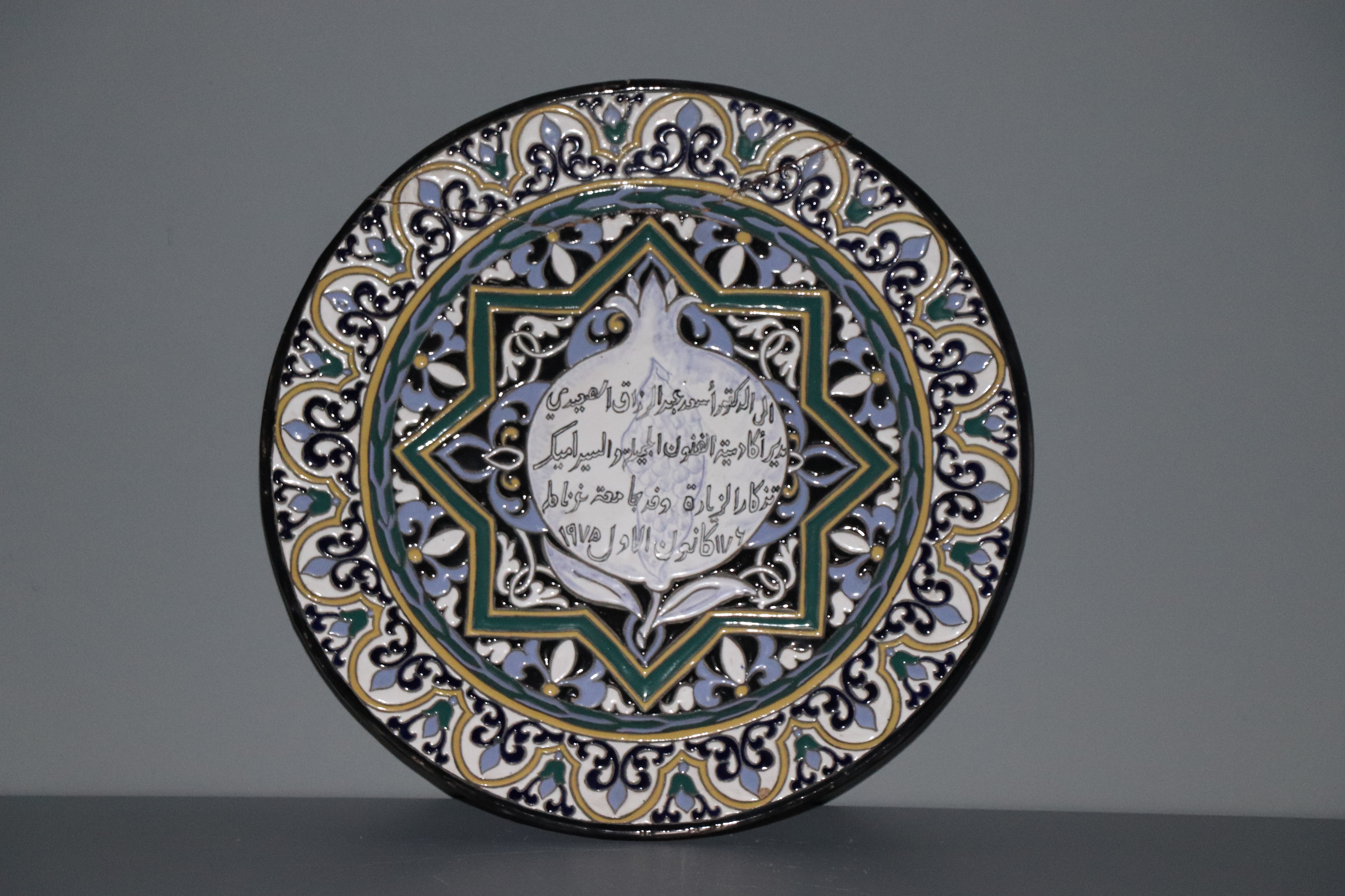 Este plato fue realizado en la Fábrica de Cerámica San Isidro de Granada en 1975, aunque se desconoce si su autoría pertenece a Agustín Morales Alguacil. Asimismo, como certifica la inscripción de la granada central, esta obra es resultado del viaje que hizo el maestro ceramista a Irak en colaboración con la Universidad de Granada para investigar las actividades y técnicas cerámicas del país, con el fin de abordar el complejo mundo histórico-artístico de la cerámica; al tiempo que, como se indica en la inscripción de la parte trasera de la pieza, esta pudo haber formado parte de una exposición de cerámica árabe celebrada en julio de 1981.