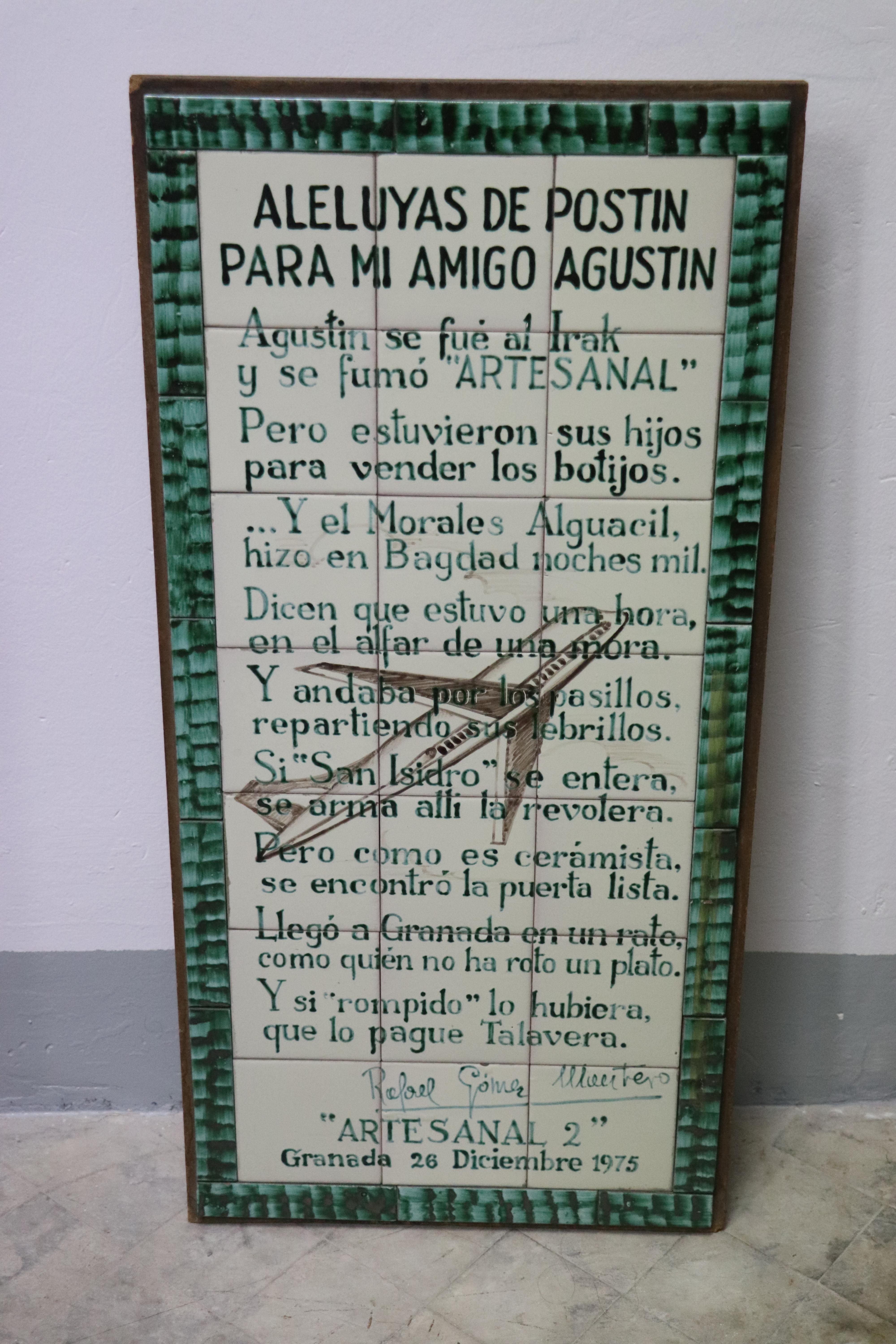 Paño de azulejos modelados en arcilla y esmaltados. En el conjunto conviven dos tipos de piezas, partiendo del marco, una serie de azulejos verdes rectangulares, pintados en verde a pincel, mientras que el paño está formado por un conjunto de piezas blancas sobre las que se realizan dos tipos de decoraciones, la epigráfica (verde) que incluye un poema de Gómez Montero y, en el centro, un avión en despegue (marrón). El poema mencionado es un homenaje de su autor al viaje realizado a Irak por Agustín Morales Alguacil en 1974: