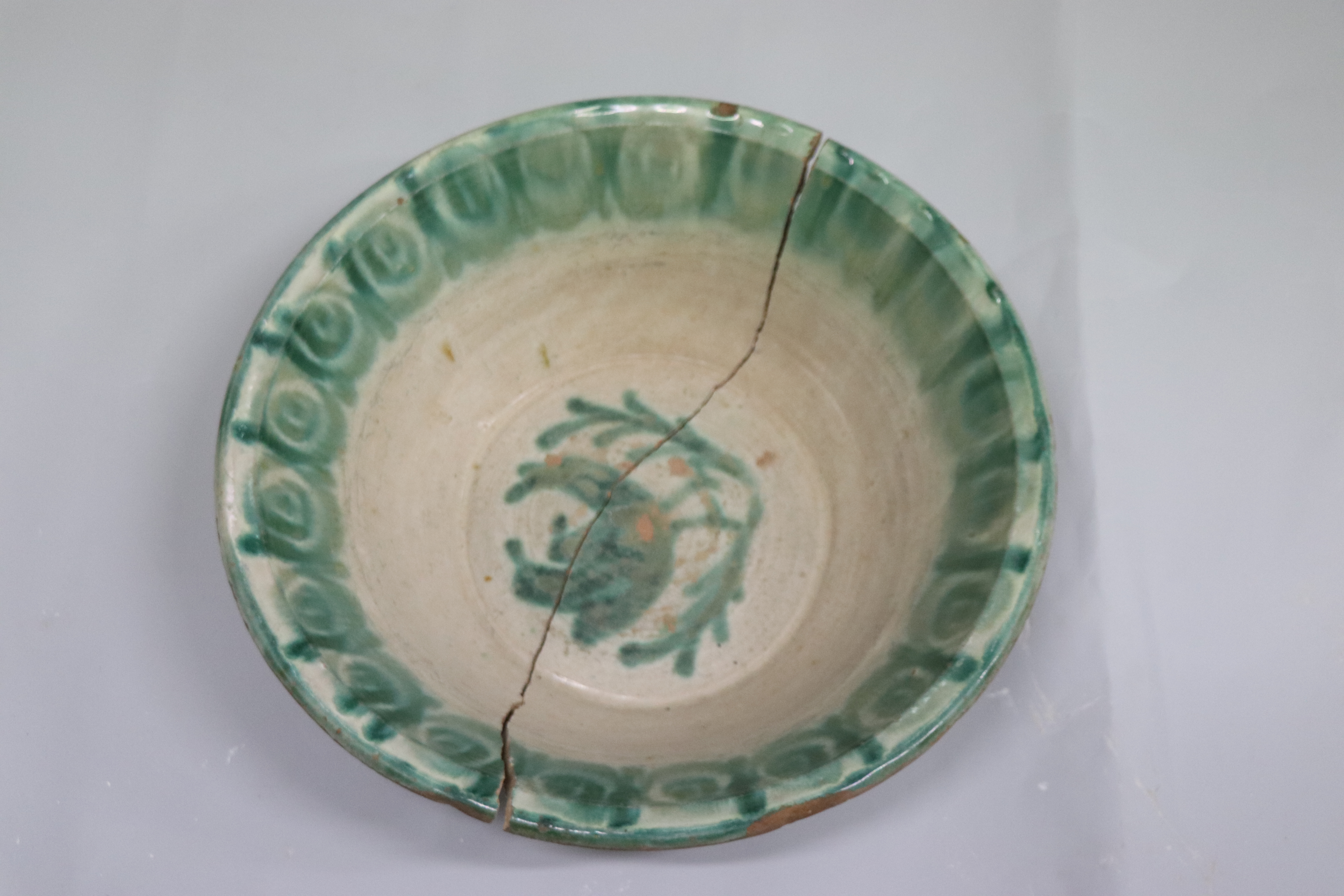 Lebrillo de cerámica granadina modelado en arcilla, torneado en anchete y culo y esmaltado en blanco con decoración repintada monocroma en verde óxido de cobre. Presenta en torno al ala una cenefa con motivos en espiral, mientras que la torta se ornamenta en su parte central con un ave con alas abiertas, apoyada sobre dos ramas en forma de "U".