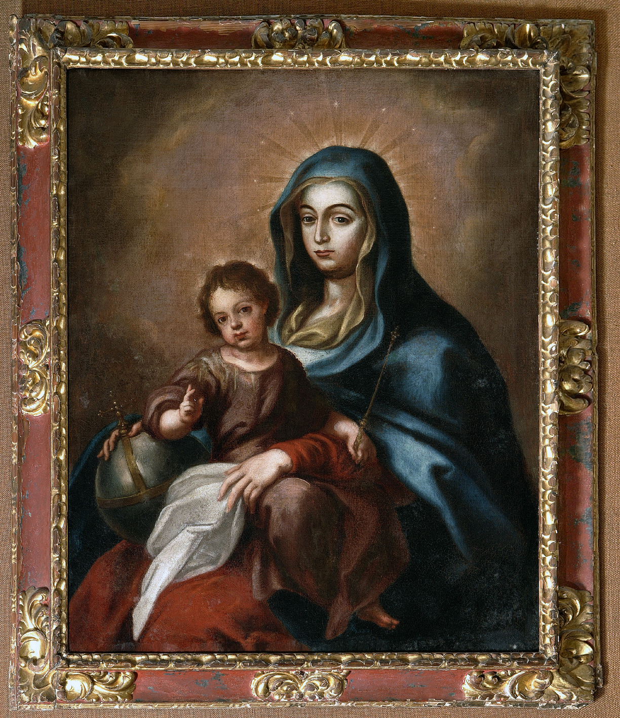 Representación barroca de la venerada imagen bizantina de la Virgen con el Niño conservada en la iglesia de Santa María del Pópulo de Roma, de la que se conservaba una copia en Granada desde la época de los Reyes Católicos. La Virgen, de medio cuerpo y sedente, vestida con túnica roja y manto azul que le cubre la cabeza, sostiene en su regazo al Niño, con túnica púrpura y potencias alrededor de la cabeza, sosteniendo el cetro con la mano izquierda y bendiciendo con la derecha. La Virgen en su mano derecha sostiene el globo terráqueo, símbolo del poder terrenal, y sobre éste una cruz griega. Rodea la cabeza de la Virgen un halo y doce estrellas. La pintura es una obra anónima de un pintor granadino de finales del siglo XVII y primer tercio del XVIII, ya que comparte rasgos estilísticos con los artistas granadinos de la época. Principalmente, el rostro de la Virgen reúne los rasgos canescos de grades párpados, cejas perfiladas y curvas, nariz recta y boca pequeña, repetidos por Bocanegra, el Niño muestra rasgos de Risueño y Chavarito.