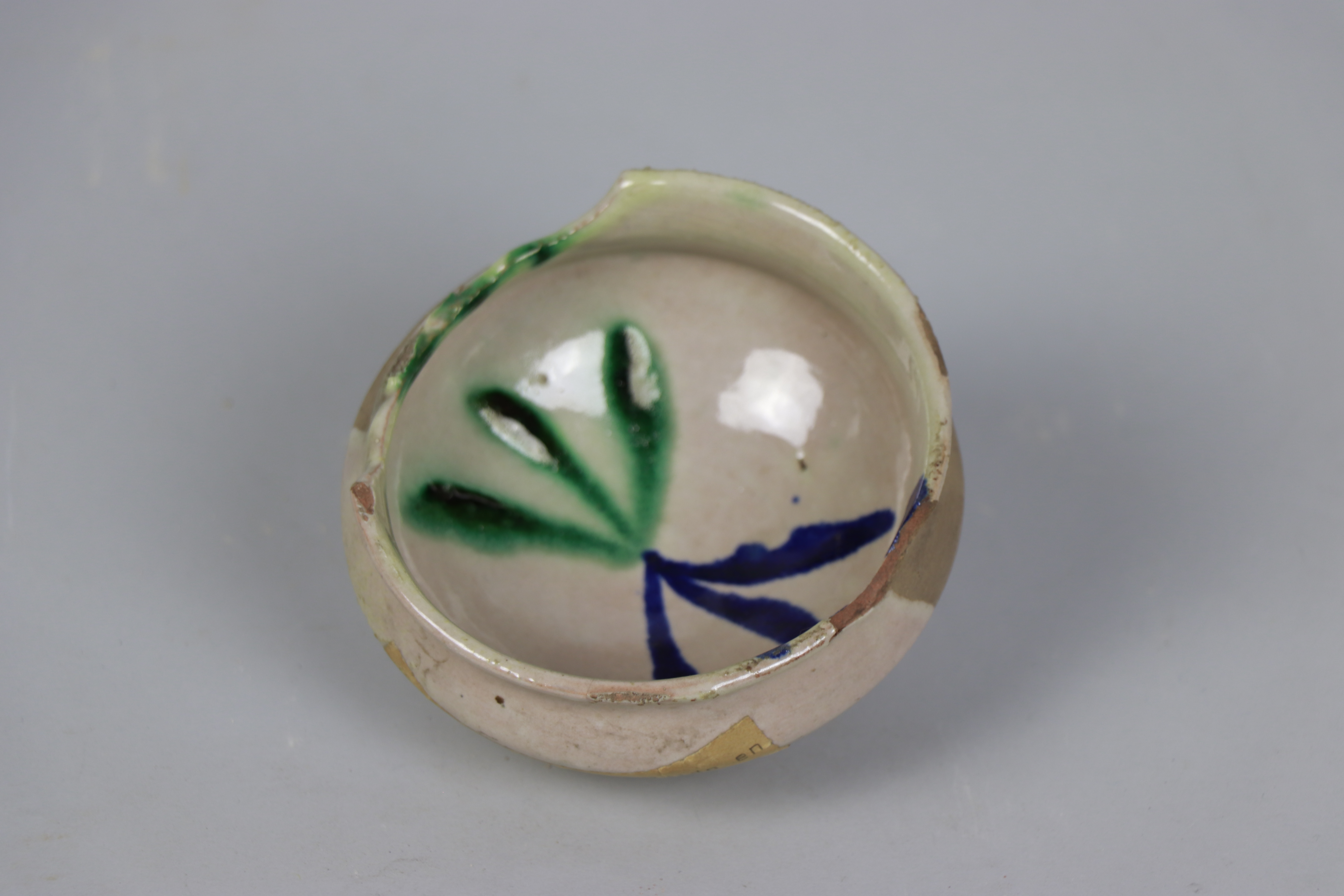 Bravera de horno de cerámica granadina torneada en pella chica y esmaltada en blanco con decoración repintada en azul cobalto y verde óxido de cobre. En su interior se decora con un motivo vegetal esquemático de seis hojas, compuesto en simetría en dos mitades, una azul y verde la otra.