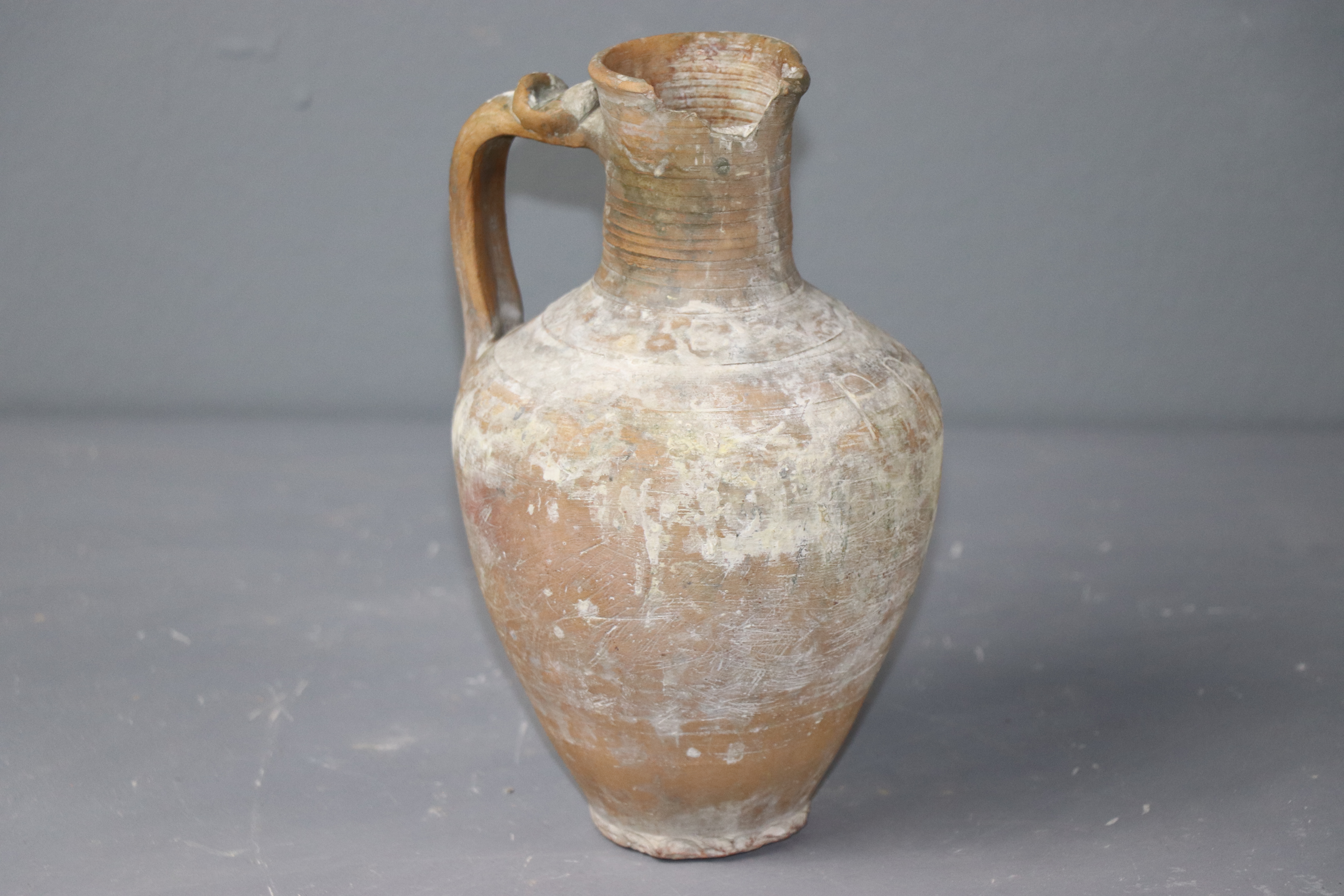 Botijo modelado en arcilla y torneado en pella chica. era utilizado por el pintor de la cerámica para contener agua en el esmalte. Se encuentra manchado de pigmento, sobre todo blanco y tiene un roto en la boca que seguramente servía para sujetar un pincel