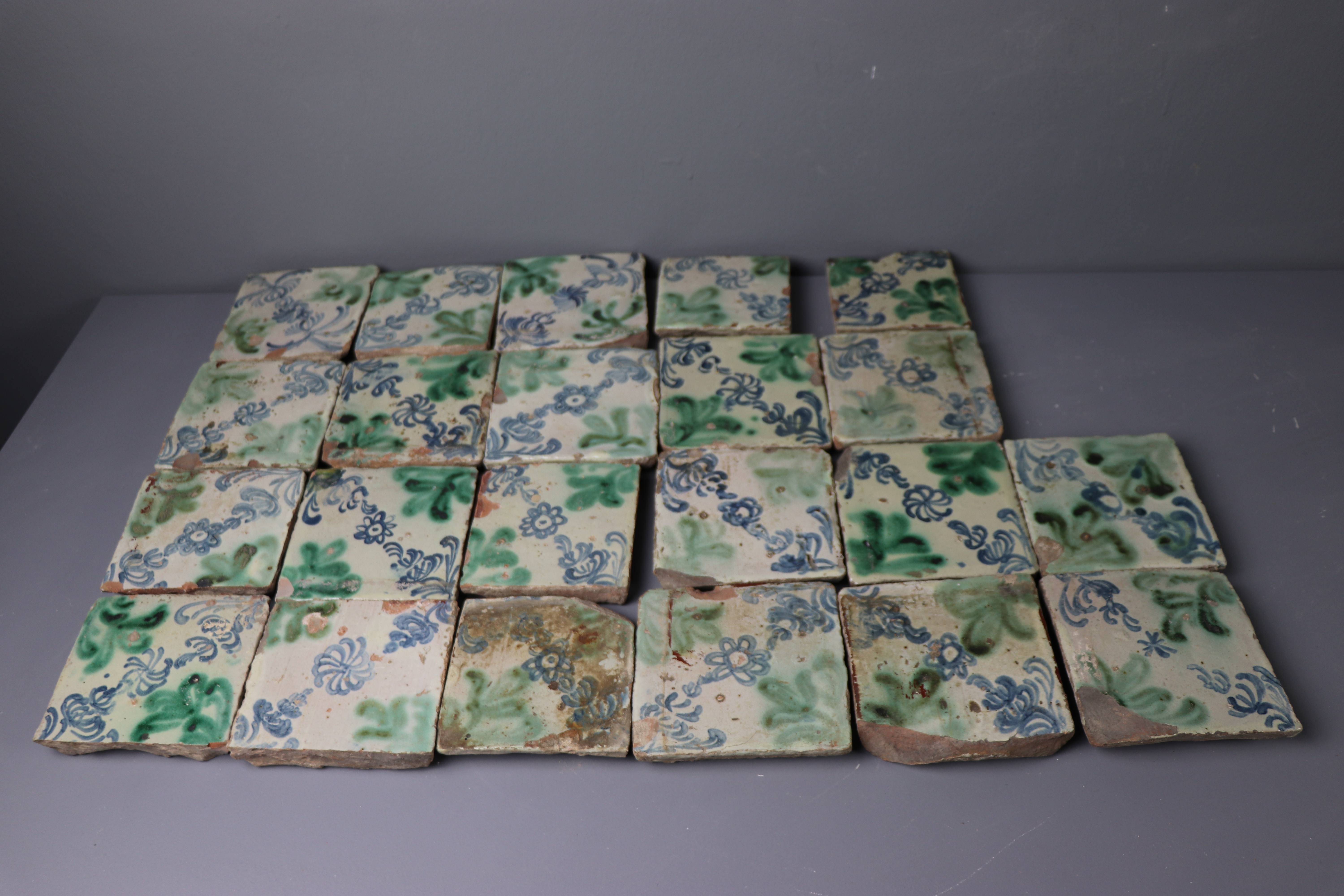 Esta pieza está formada por 22 olambrillas de cerámica granadina modeladas en arcilla y esmaltadas en blanco con decoración corriente en azul cobalto y verde óxido de cobre. Ornamentadas con motivos geométricos y vegetales, realizados mediante trazos sueltos haciendo uso de una técnica tradicional.