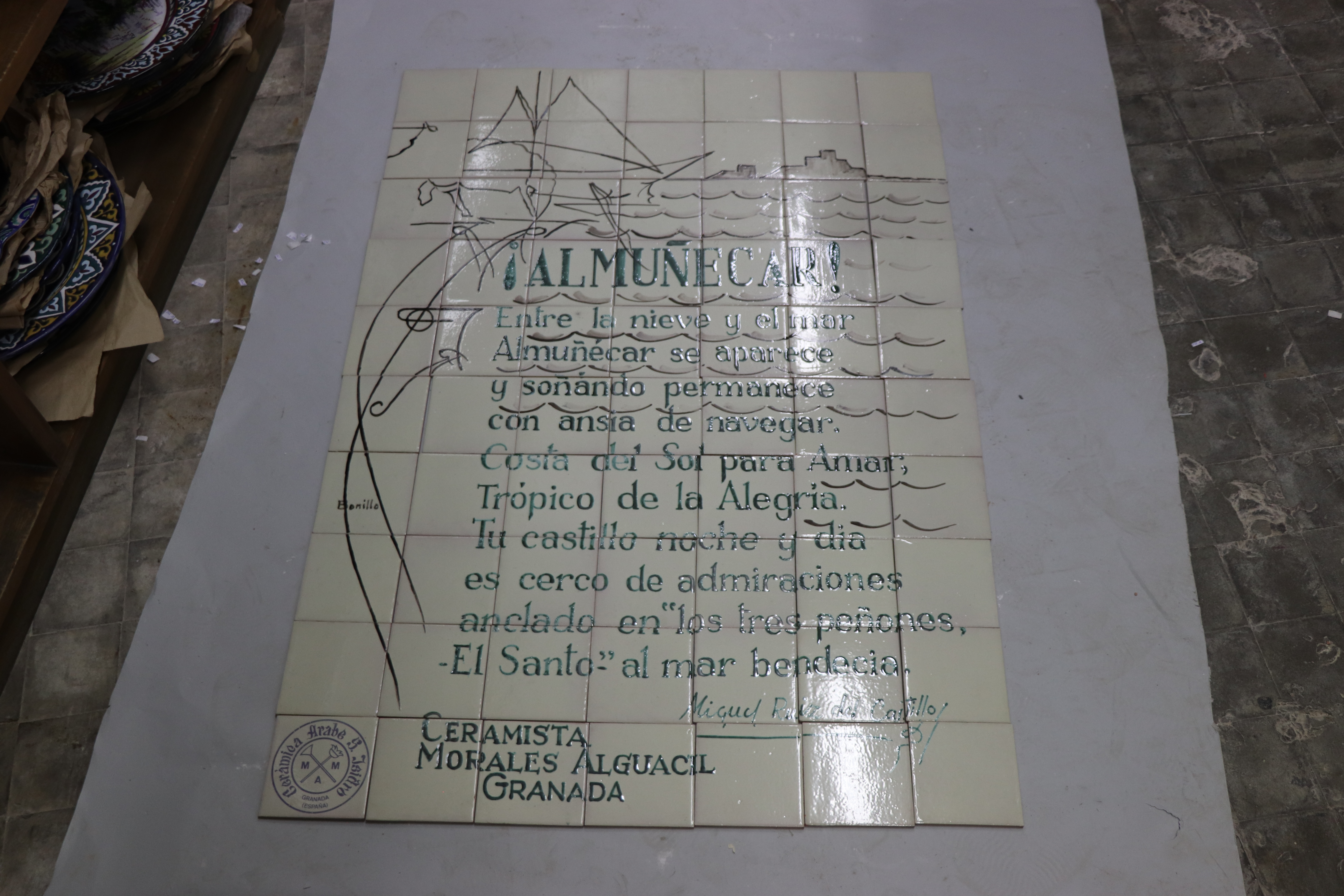 Paño de azulejos modelados en arcilla y esmaltados, decorados con el dibujo de un velero en mitad del mar frente a la costa sexitana que se perfila mediante una esquemática fortaleza en alusión al Castillo de San Miguel. La representación es esquemática, sin relleno, haciendo uso de una fina línea para marcar los contornos de las siluetas a representar. Bajo esta se reproduce el poema de Miguel Ruiz del Castillo, Oda a Almuñécar: