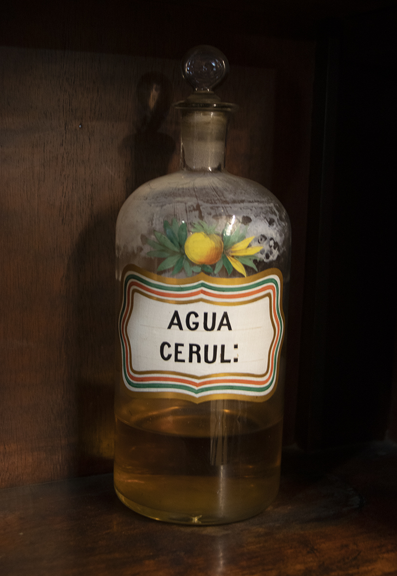 Bote cilíndrico de vidrio transparente, cuello corto y boca estrecha con reborde plano que se cierra mediante un tapón realizado también en vidrio esmerilado transparente. Forma parte del conjunto de botes farmacéuticos de la Farmacia Zambrano, identificables todos ellos por contar con un mismo diseño decorativo de cartela que aparece pintada sobre el propio bote, con un fondo blanco donde  aparece, en negro y en mayúsculas, el nombre de su contenido, en este caso “AGUA/CERUL:”. Decoran el perímetro de la cartela mixtilínea cuatro franjas  de color (dorado, rojo, verde y nuevamente dorado) que se intercalan con tres franjas blancas, siendo la última, dorada, algo más gruesa que el resto. Centrado sobre la cartela, un motivo vegetal formado por lo que parece ser una naranja con hojas en abanico a ambos lados remata la composición.
