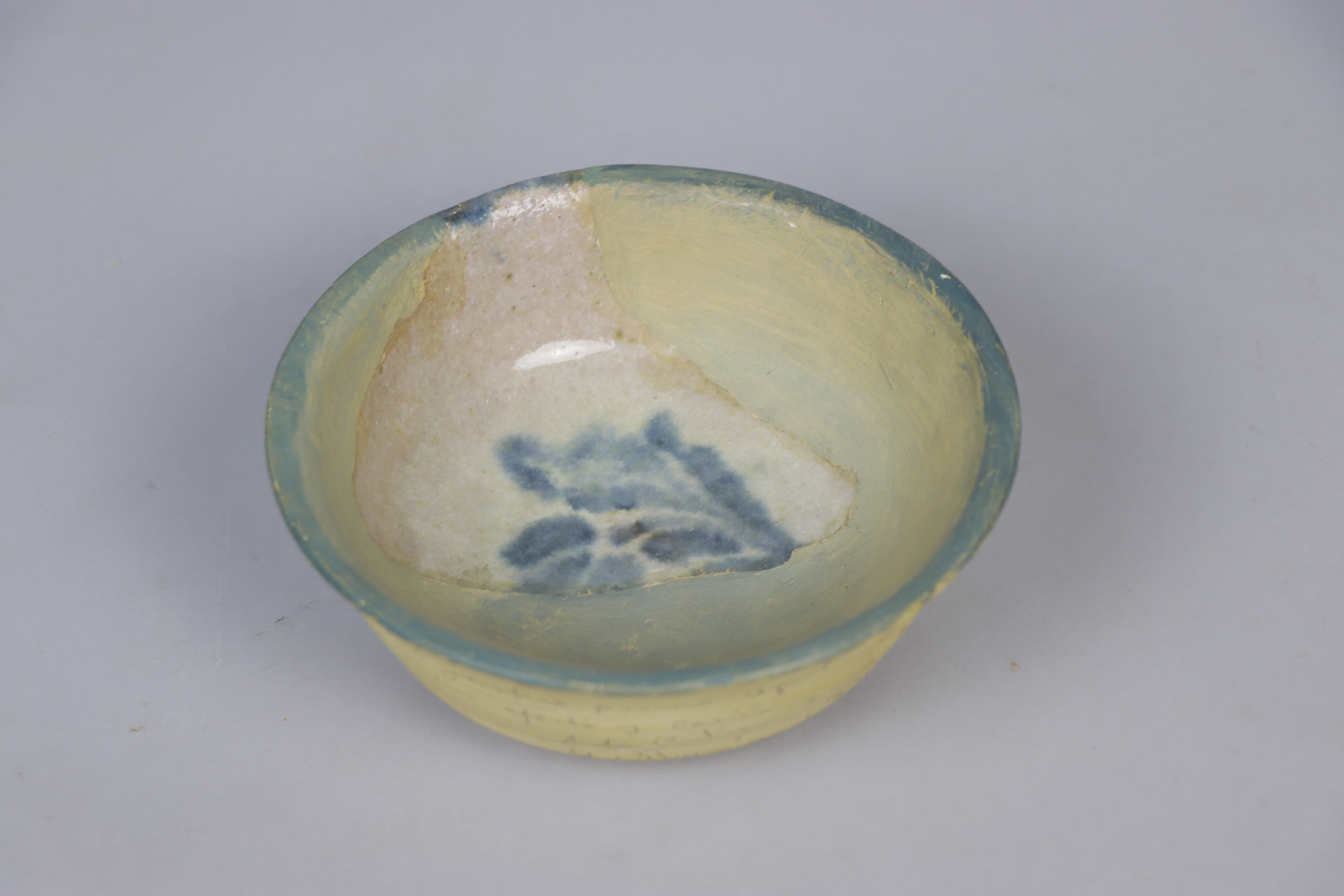 Este cuenco de cerámica granadina está modelado en arcilla, torneado en pella grande y esmaltado en blanco con decoración corriente monocroma en azul cobalto. En el interior cuenta con un motivo vegetal que refleja la ornamentación prototípica de la cerámica de tradición nazarí.