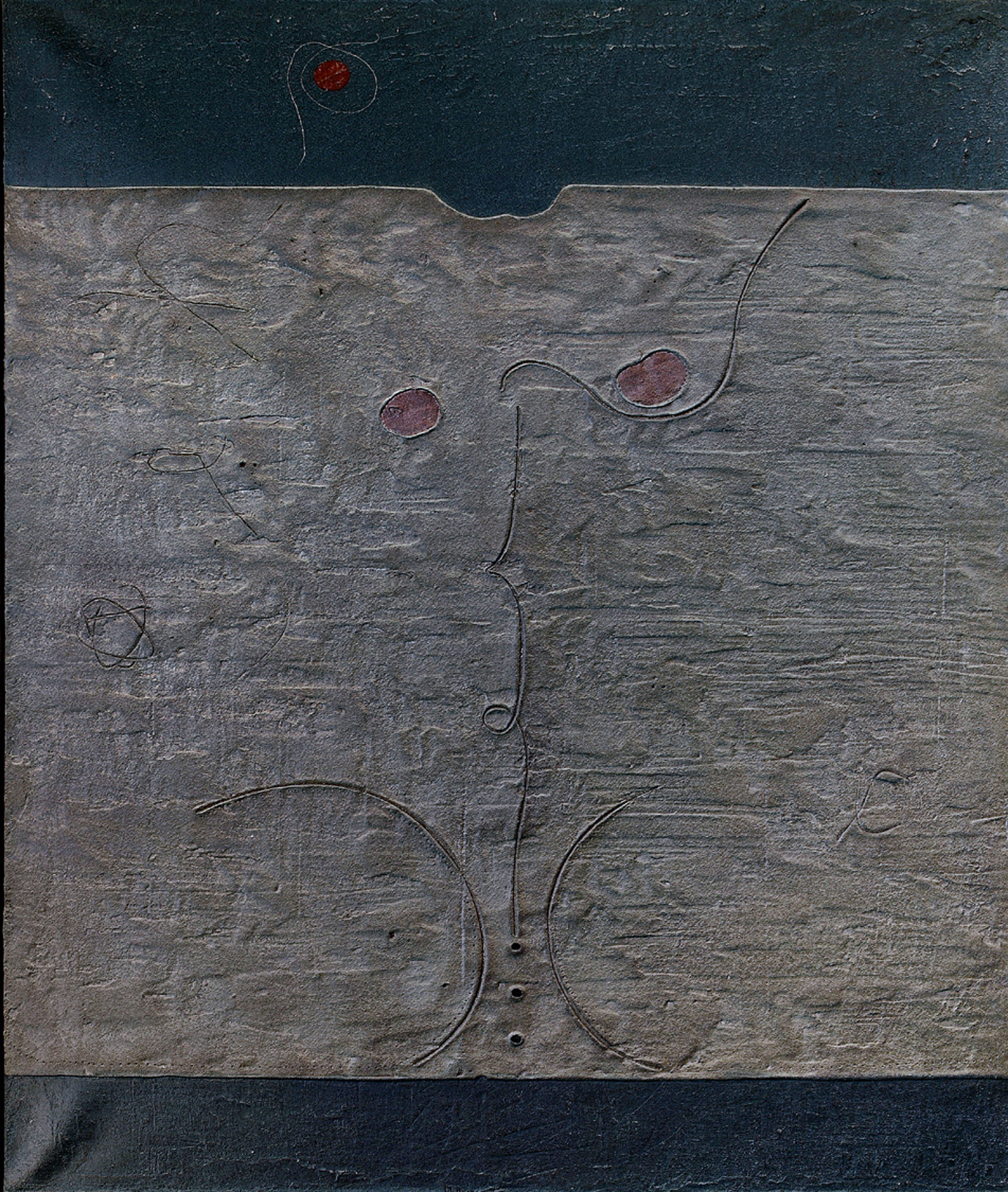 El escaso cromatismo de la obra, basado en tonalidades neutras (negro y gris) sobre las que se superponen manchas rojas, contrasta con la riqueza de texturas, con superposiciones, incisiones y un trabajo del material que confiere a la pieza una extraordinaria expresividad plástica. La obra está firmada y fechada por su autor, "J.M. Brazam 71", en el centro del margen inferior.