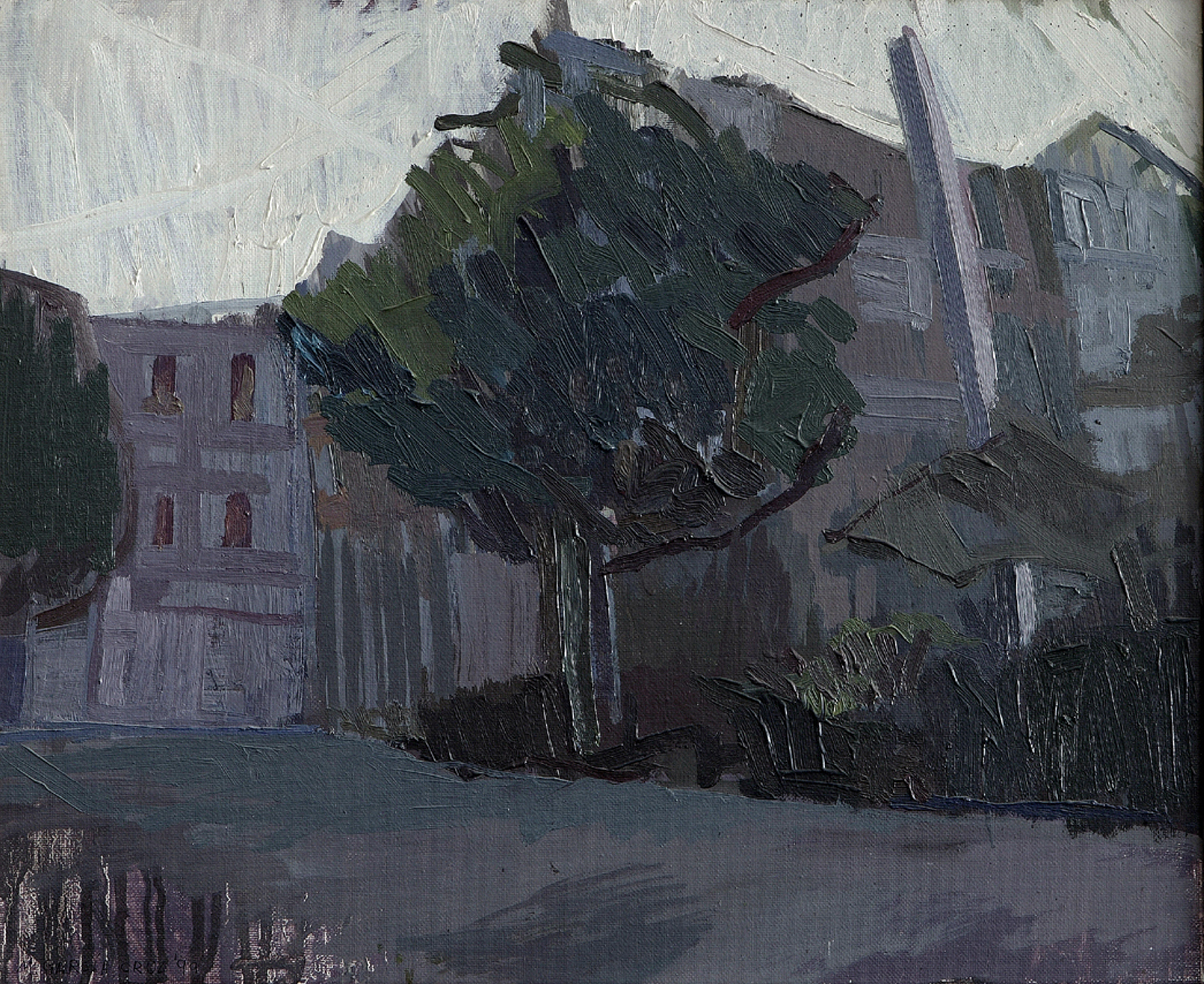Se trata de una panorámica exterior del Gran Hotel de Mondáriz, en Pontevedra, con la entrada al complejo a la izquierda y a la derecha el área industrial con una esbelta chimenea. El autor ha empleado una pincelada suelta y pastosa, de cromatismo muy contrastado, para presentar la decadente visión del conjunto en ruinas, centrada por la silueta del gran árbol que se yergue ocultando la Fuente de Gándara. El Gran Hotel de Mondáriz fue inaugurado en 1898, y albergaba entre otras instalaciones una planta embotelladora y un hospital. Todo ello ardió en 1973.
