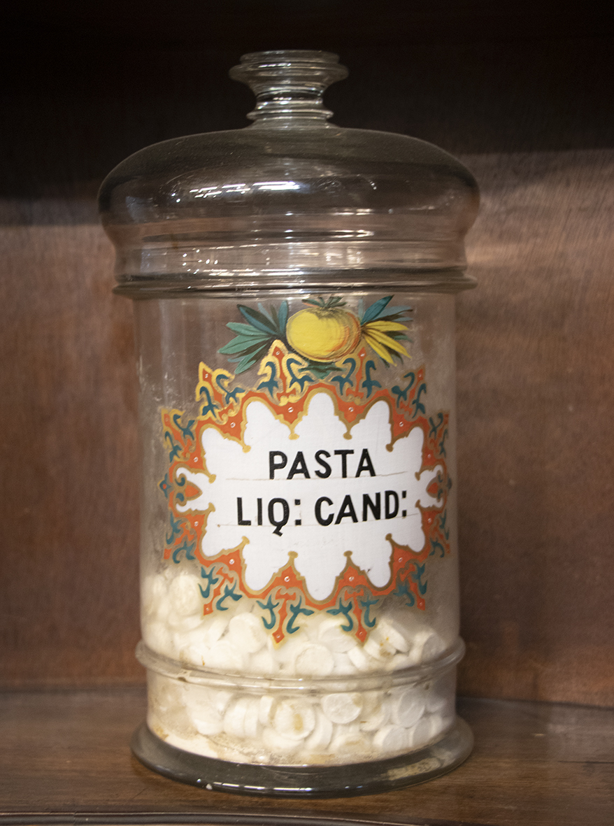 Estos botes formaban, junto con los albarelos y los frascos de vidrio, el conjunto de botamen de unas 453 piezas de la Farmacia. Su forma específica de boca ancha está ligada a su uso para contener sólidos como granulados, pastillas, polvos, plantas medicinales…