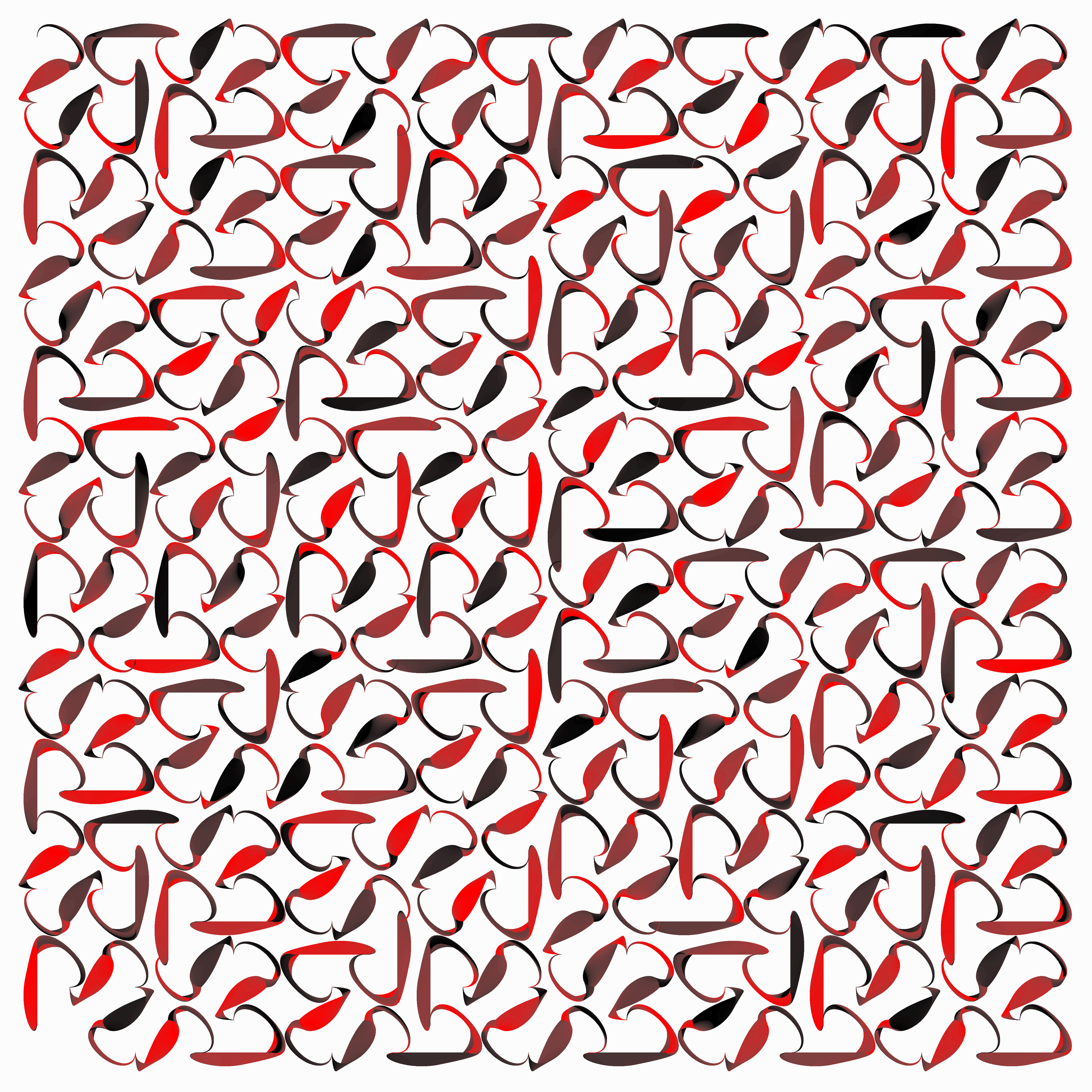 Patrón generado por delicadas formas recortadas sobre fondo blanco que constan de una parte gruesa, con un lado recto, y otra más delgada y curva que se cierra sobre la anterior en un ángulo de 45 grados. Cada parte de la forma está diferenciada también por su color, verde o rojo, y en su distribución subyace una retícula de 16x16, que se hace evidente gracias a la alineación de la parte recta de las formas con el eje vertical u horizontal de la imagen.